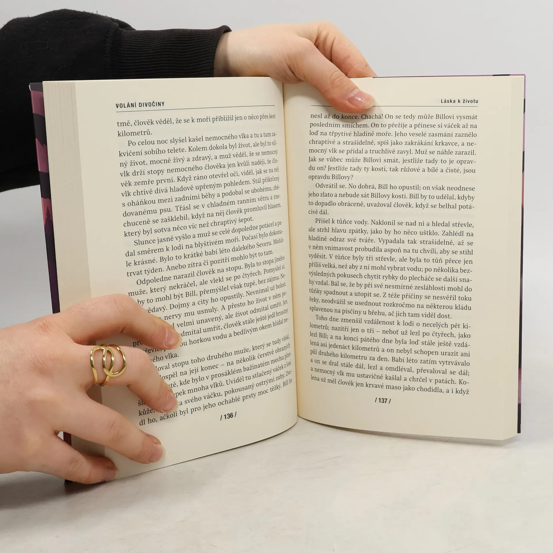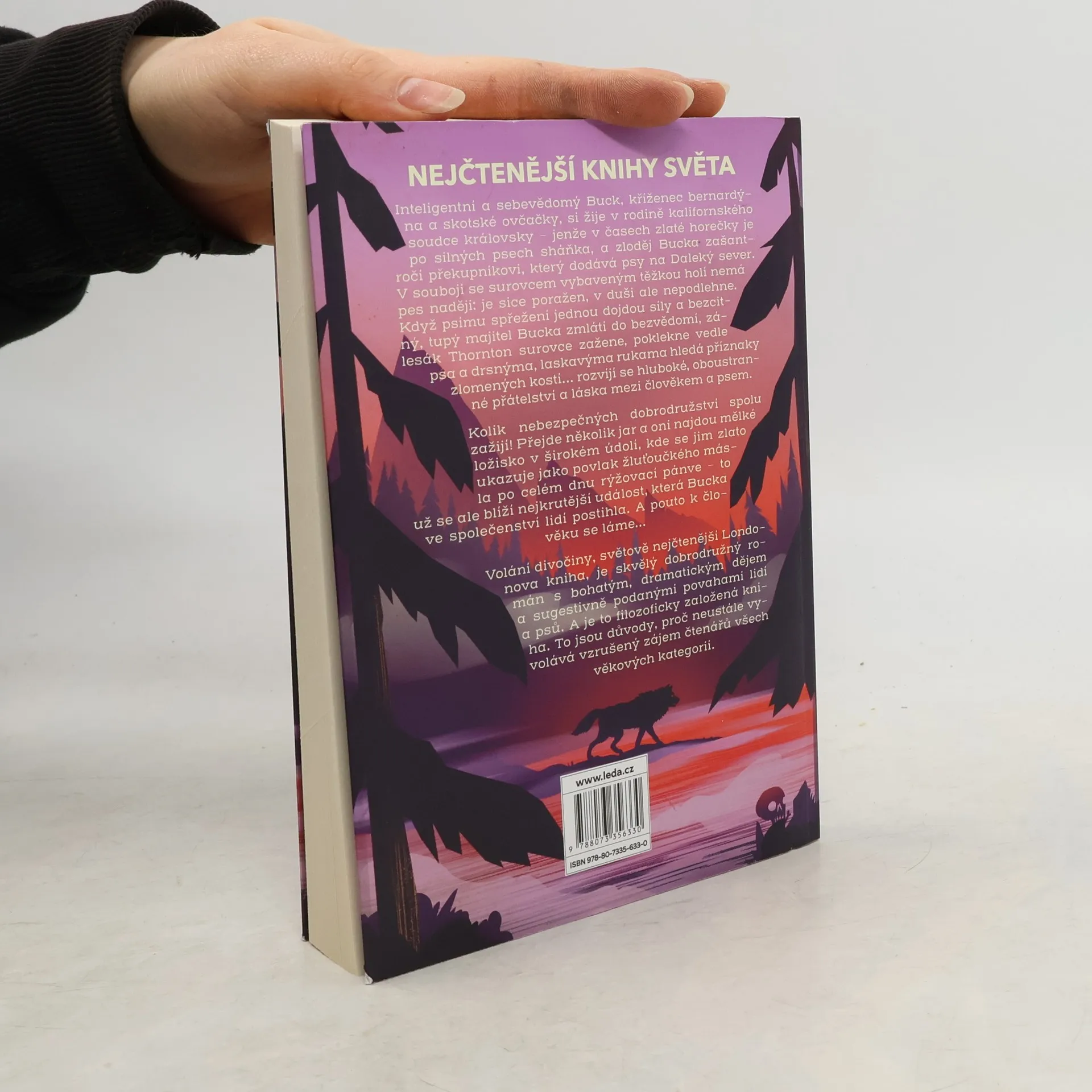Inteligentní a sebevědomý Buck, kříženec bernardýna a skotské ovčačky, si žije v rodině kalifornského soudce královsky – jenže v časech zlaté horečky je po silných psech sháňka, a zloděj Bucka zašantročí překupníkovi, který dodává psy na Daleký sever. V souboji se surovcem vybaveným těžkou holí nemá pes naději: je sice poražen, v duši ale nepodlehne. Když psímu spřežení jednou dojdou síly a bezcitný, tupý majitel Bucka zmlátí do bezvědomí, zálesák Thornton surovce zažene, poklekne vedle psa a drsnýma, laskavýma rukama hledá příznaky zlomených kostí… rozvíjí se hluboké, oboustranné přátelství a láska mezi člověkem a psem. Kolik nebezpečných dobrodružství spolu zažijí! Přejde několik jar a oni najdou mělké ložisko v širokém údolí, kde se jim zlato ukazuje jako povlak žluťoučkého másla po celém dnu rýžovací pánve – to už se ale blíží nejkrutější událost, která Bucka ve společenství lidí postihla. A pouto k člověku se láme… Volání divočiny, světově nejčtenější Londonova kniha, je skvělý dobrodružný román s bohatým, dramatickým dějem a sugestivně podanými povahami lidí a psů. A je to filozoficky založená kniha. To jsou důvody, proč neustále vyvolává vzrušený zájem čtenářů všech věkových kategorií.