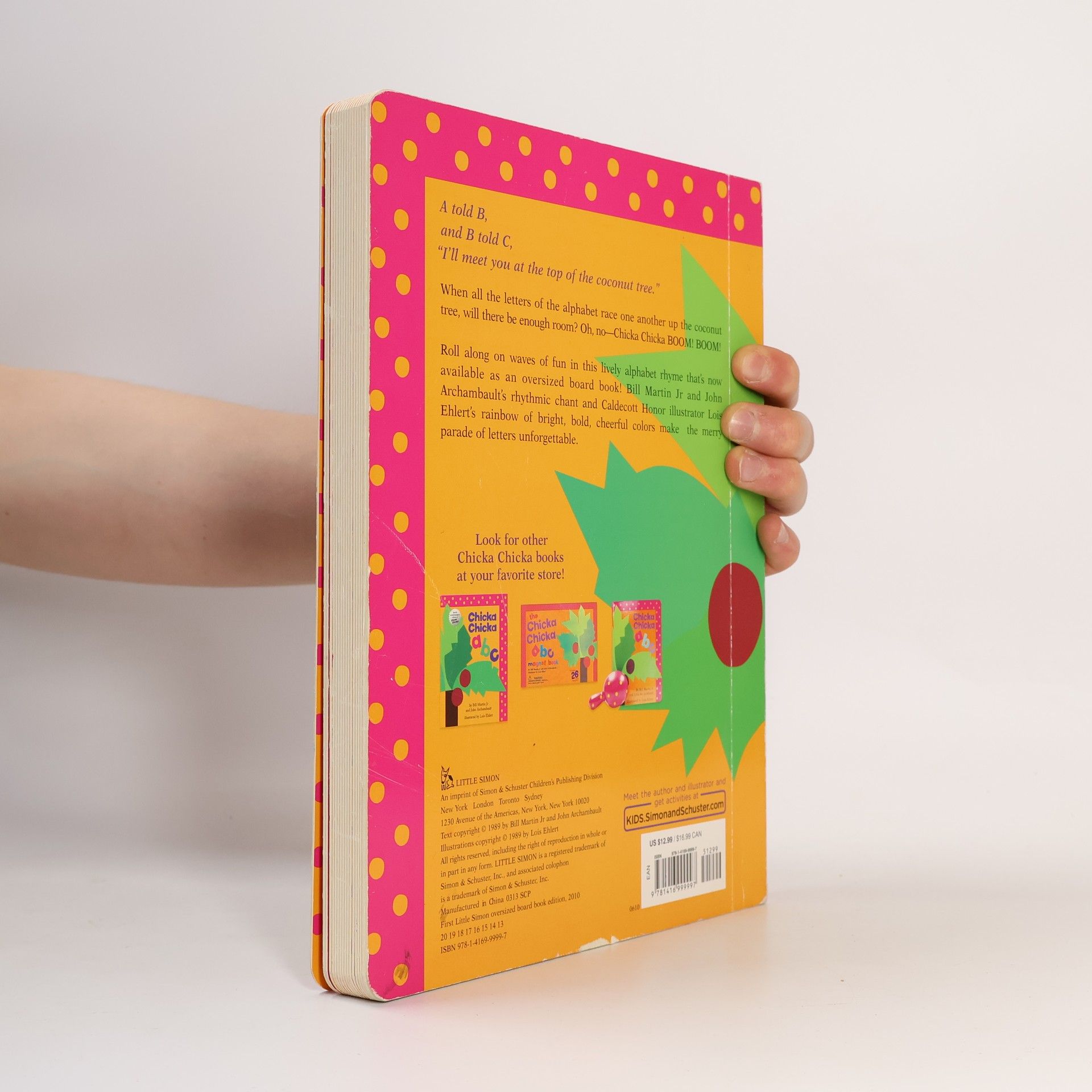 Chicka chick boom boom! Will there be enough room? There is always enough room for this rolicking alphabet chant that is been a children's favorite for over 20 years! Bill Martin Jr. and John Archambault's rhythmic rhymes and Caldecott Honor illustrator Lois Ehlert's bold, cheerful art has made the Chicka Chicka series a classic! For the first time ever, the complete edition of the original Chicka Chicka Boom Boom story will be available in a new lap-sized board book that will surely delight a new generation of Chicka Chicka fans.