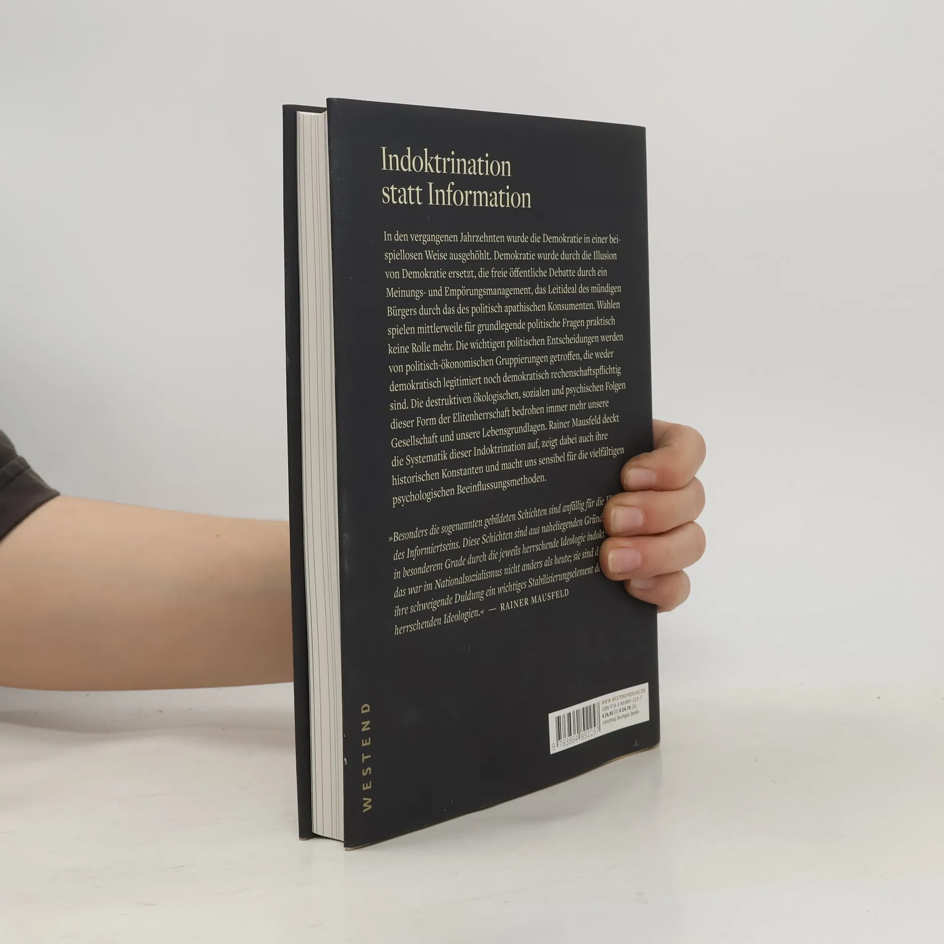 In den vergangenen Jahrzehnten wurde die Demokratie in einer beispiellosen Weise ausgehöhlt. Demokratie wurde durch die Illusion von Demokratie ersetzt, die freie öffentliche Debatte durch ein Meinungs- und Empörungsmanagement, das Leitideal des mündigen Bürgers durch das des politisch apathischen Konsumenten. Wahlen spielen mittlerweile für grundlegende politische Fragen praktisch keine Rolle mehr. Die wichtigen politischen Entscheidungen werden von politisch-ökonomischen Gruppierungen getroffen, die weder demokratisch legitimiert noch demokratisch rechenschaftspflichtig sind. Die destruktiven ökologischen, sozialen und psychischen Folgen dieser Form der Elitenherrschaft bedrohen immer mehr unsere Gesellschaft und unsere Lebensgrundlagen. Rainer Mausfeld deckt die Systematik dieser Indoktrination auf, zeigt dabei auch ihre historischen Konstanten und macht uns sensibel für die vielfältigen psychologischen Beeinflussungsmethoden.