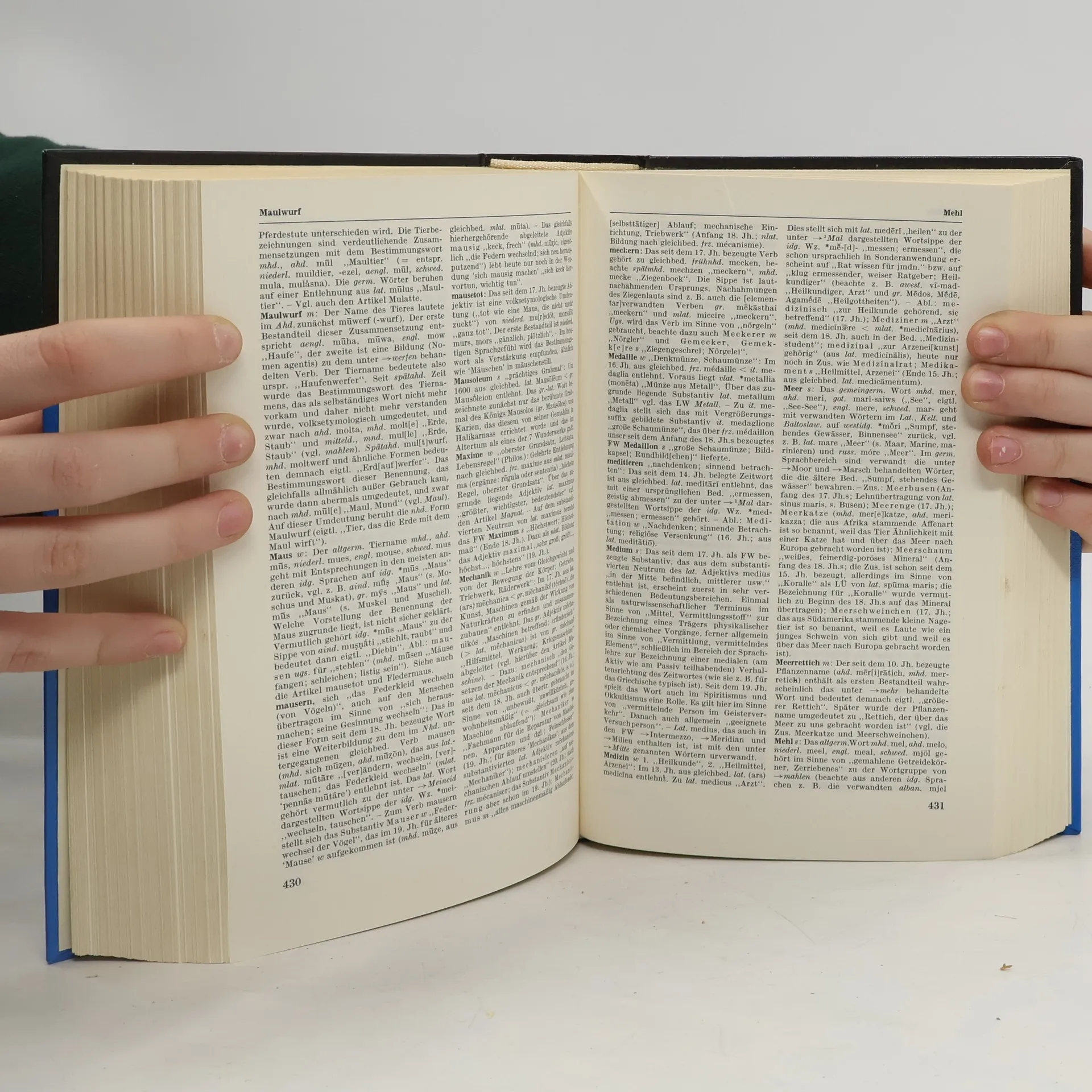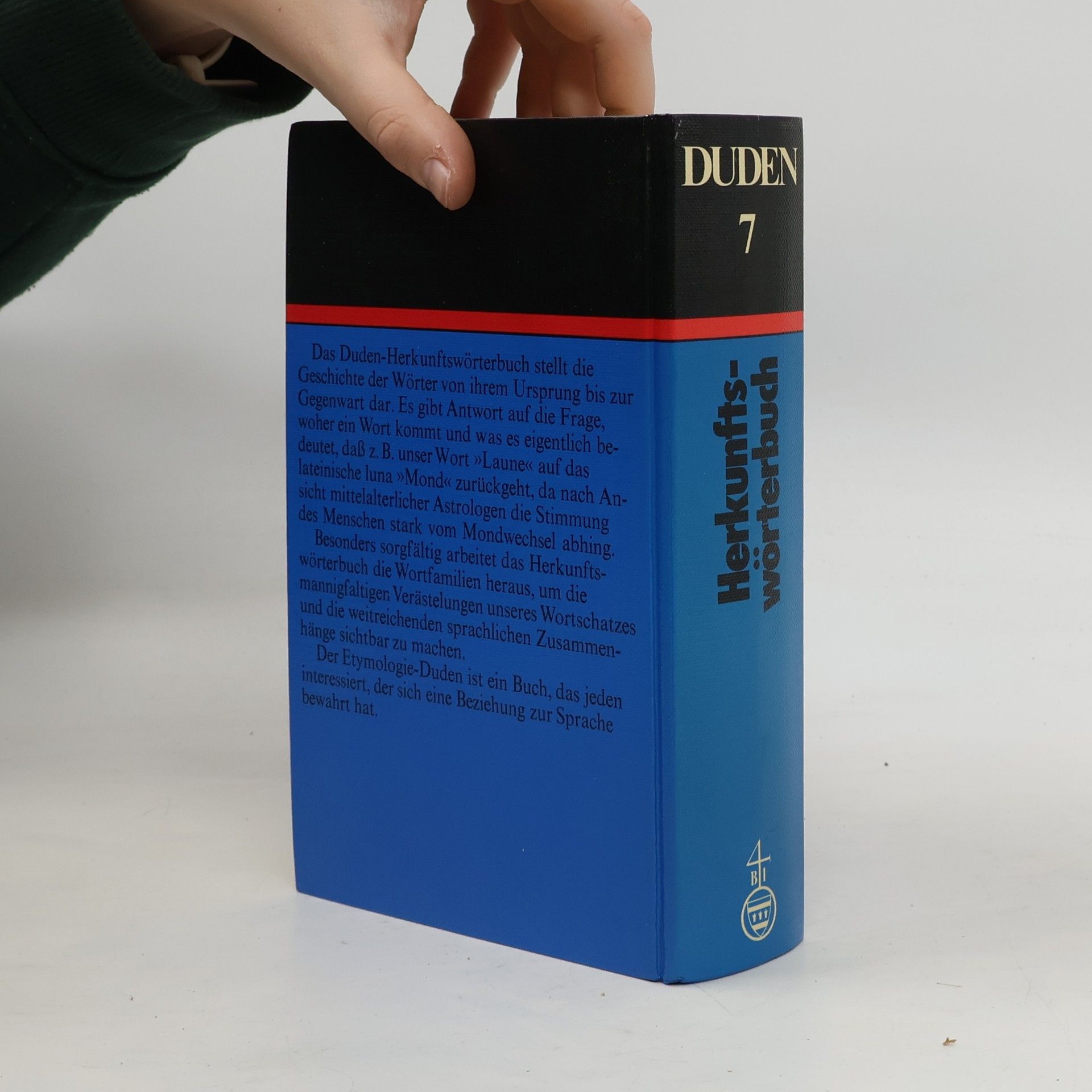 La quatrième de couverture indique : "Dieses etymologische Wörterbuch erklärt, woher ein Wort stammt und was es ursprünglich bedeutete. Es arbeitet die Wortfamilien heraus und verknüpft die Wortgeschichte mit der Kultur- und Geistesgeschichte. In diesem Band erfährt man z. B., dass unser Wort " Laune" auf lateinisch luna "Mond' zurückgeht, da nach Ansicht mittelalterlicher Astrologen die Stimmung des Menschen stark vom Mondwechsel abhing, dass ausser "Bank" (Geldinstitut) auch "Kasse, Konto, Bilanz, Diskoont, brutto, netto" und andere Wörter aus dem italienischen Bankwesen stammen und dass "Sülze, Selters, Sosse, Salami, Salat, Salpeter" alle mit "Salz" zusammenhängen."