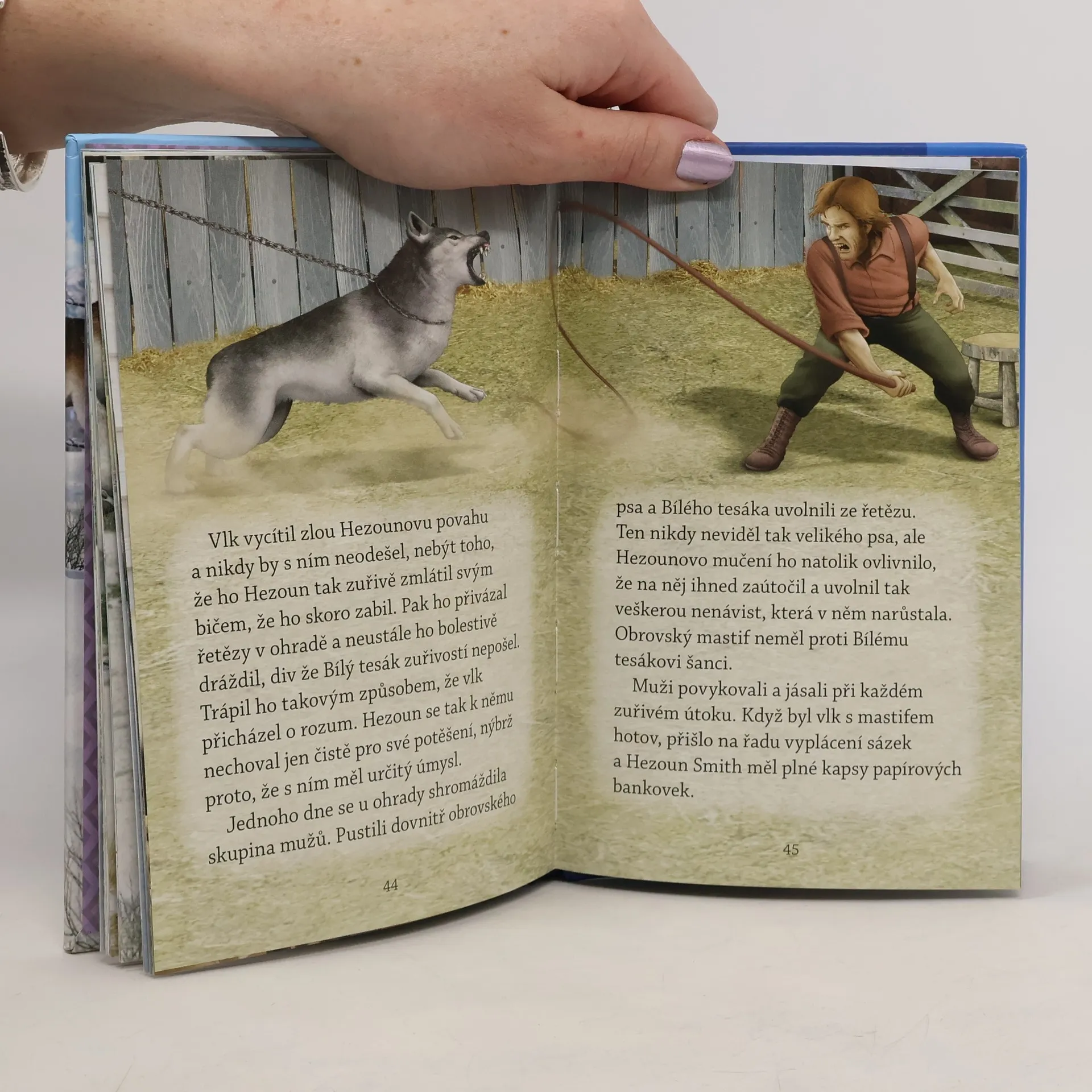 Převyprávěný a zkrácený příběh Bílého tesáka, napůl vlka a napůl psa, který překonává nástrahy drsného života.