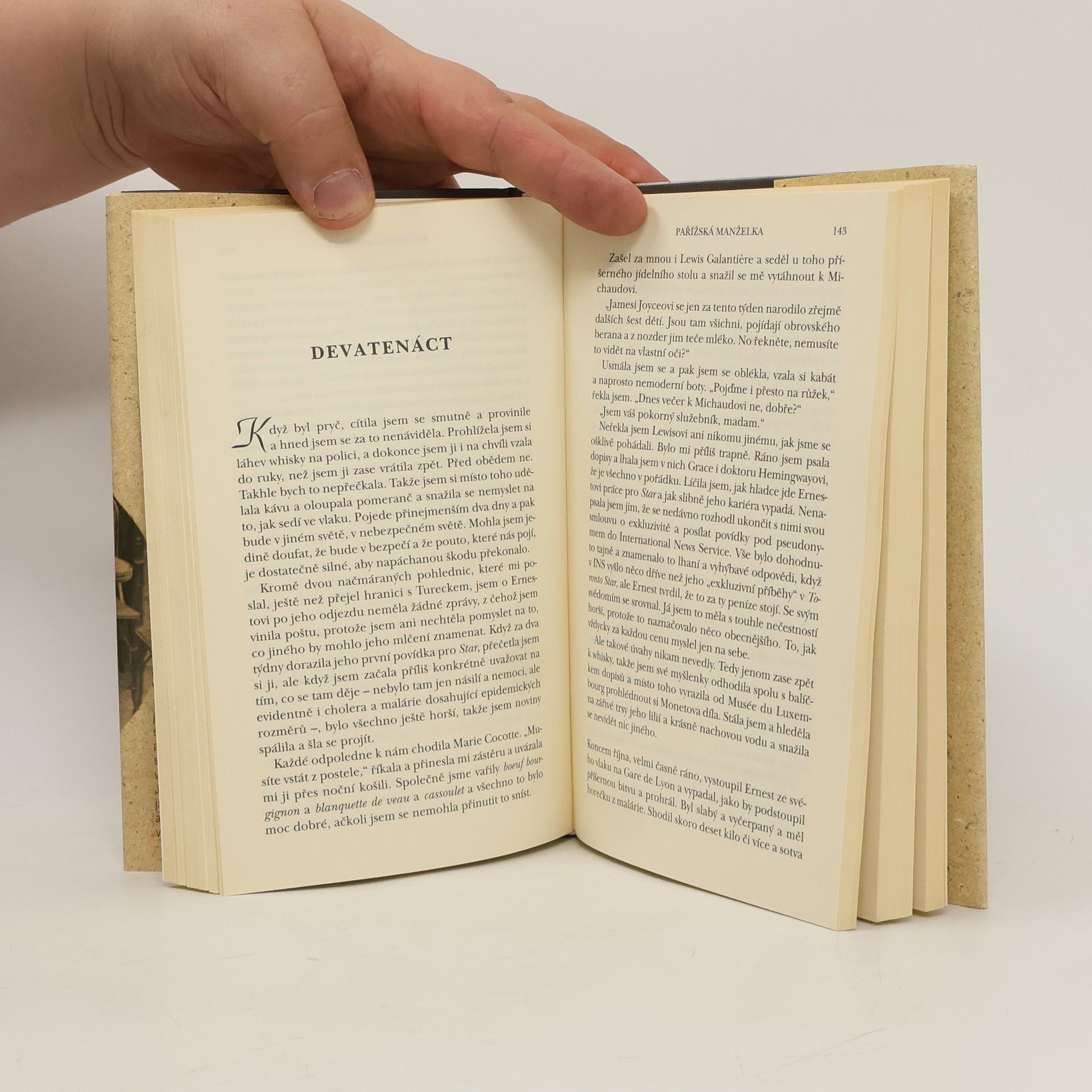 Dychtivost počínající lásky, proplétání citů a vztahů i bolest nečekaného, leč nevyhnutelného rozchodu, to všechno se vine příběhem manželství Hadley Richardsonové s Ernestem Hemingwayem. Na počátku je to jen mladík se sžíravou touhou uchopit mnohotvárnost světa a přetavit ji do slov, trpící děsivými nočními můrami z války a mučivou nejistotou. Poválečná Paříž je uvítá svými kavárničkami, uměleckými salony a nekonečnými večírky. Ernestovo ego trpí nedostatkem uznání, ale přesto hltá život naplno, fascinován jím stejně jako smrtí - na stránkách svých děl i v krvavé býčí aréně, kam se vrací, i když už se mu všechno hroutí pod rukama. Jejich divoká, bytostná láska jako by strávila sama sebe a dospěla k hořkému, přesto však osvobozujícímu konci…