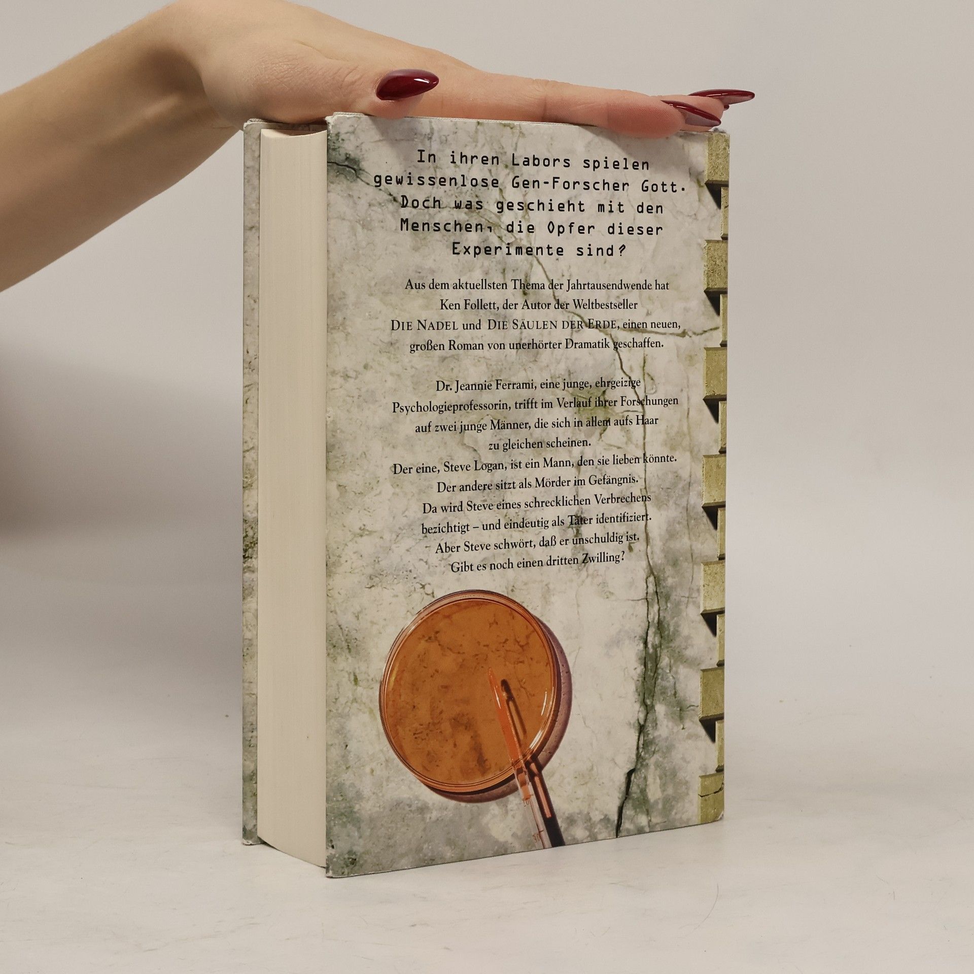 Stellen Sie sich vor, es gibt einen Menschen, der Ihnen aufs Haar gleicht, bis in die kleinste Zelle ... Jeannie Ferrami, eine brillante, ehrgeizige Wissenschaftlerin, die sich mit der Entstehung kriminellen Verhaltens befaßt, entdeckt ein solches Paar genetischer Zwillinge. Der eine, Steve Logan, studiert Jura. Der andere sitzt als Mörder im Gefängnis. Da wird Steve eines schrecklichen Verbrechens bezichtigt - und eindeutig als Täter identifiziert. Aber Steve ist unschuldig. Gibt es noch einen dritten Zwilling? Wie in seinen historischen Meisterwerken zeigt Ken Follett auch seinem neuen Roman das dramatische Schicksal von Menschen in ihrer Zeit - diesmal mit einem brandaktuellen Thema von heute.