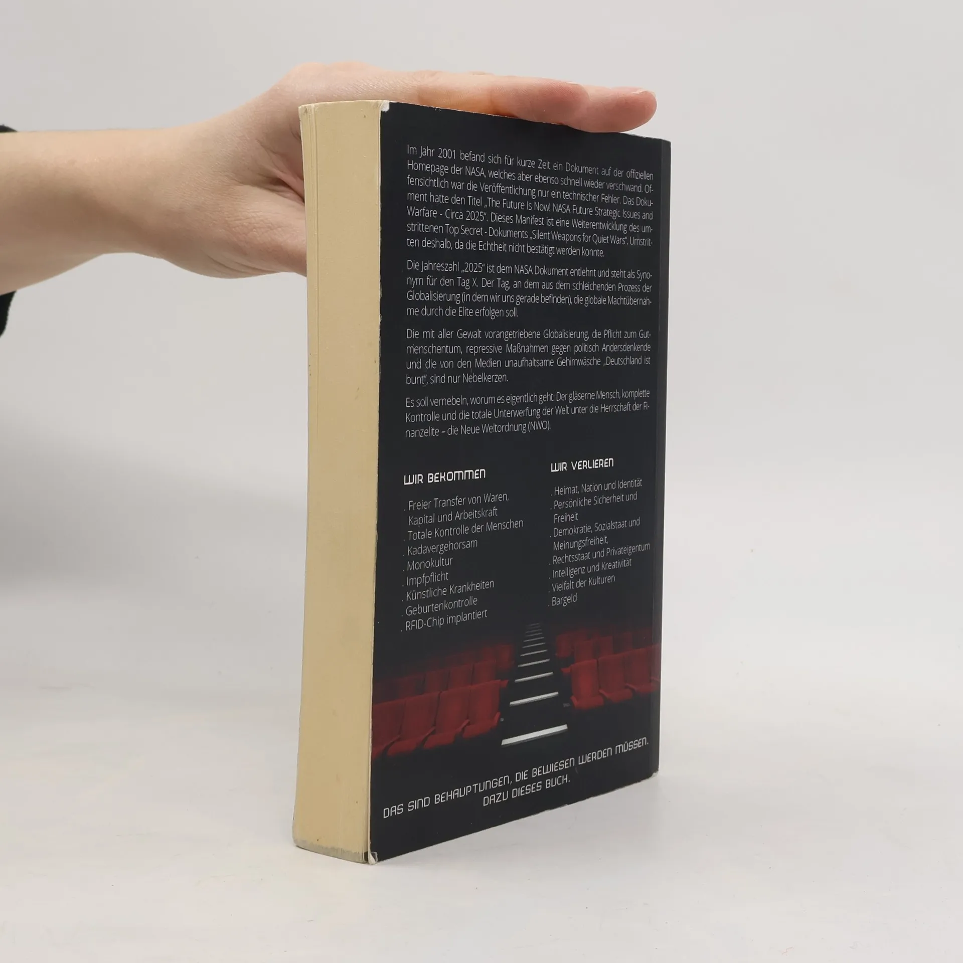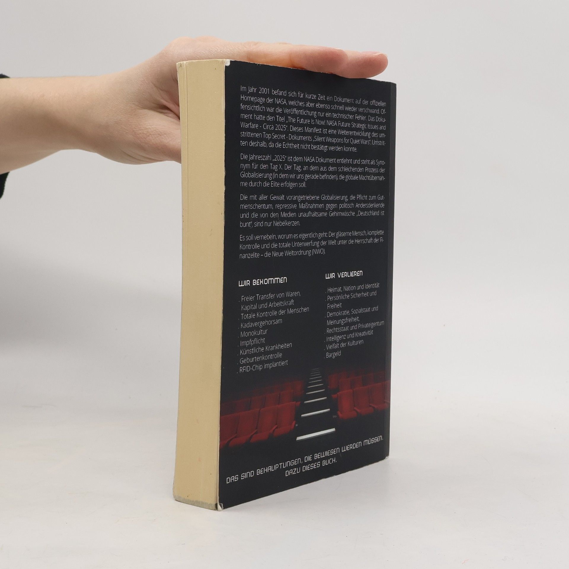 Im Jahr 2001 erschien kurzzeitig ein Dokument auf der NASA-Website, das schnell wieder entfernt wurde. Der Titel „The Future Is Now! NASA Future Strategic Issues and Warfare - Circa 2025“ deutet auf eine strategische Vision hin, die als Weiterentwicklung des umstrittenen Dokuments „Silent Weapons for Quiet Wars“ gilt. Die Jahreszahl „2025“ symbolisiert den Tag X, an dem die Elite die globale Machtübernahme anstrebt. Die forcierte Globalisierung, der Druck zur politischen Korrektheit, repressive Maßnahmen gegen Andersdenkende und die mediale Gehirnwäsche sind Ablenkungen von den wahren Zielen: totale Kontrolle und Unterwerfung unter die Finanzelite – die Neue Weltordnung (NWO). Die angestrebten Veränderungen umfassen den freien Transfer von Waren, Kapital und Arbeitskraft, unkontrollierten Kapitalismus, totale Kontrolle der Menschen, Kadavergehorsam, Monokultur, Impfpflicht, künstliche Krankheiten, Geburtenkontrolle und RFID-Chips. Was verloren geht, sind Heimat, Nation und Identität, persönliche Sicherheit und Freiheit, Demokratie, Sozialstaat und Meinungsfreiheit, Rechtsstaat und Privateigentum, Intelligenz und Kreativität sowie kulturelle Vielfalt und Bargeld. Diese Behauptungen bedürfen der Beweisführung, was das Ziel dieses Buches ist.