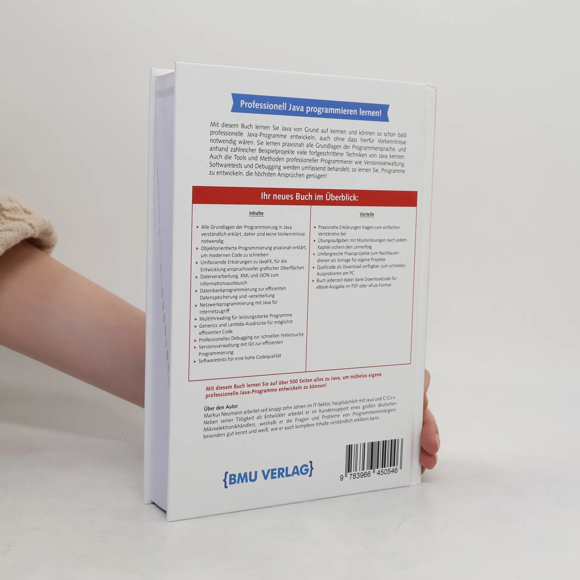 Professionell Java programmieren lernen! Dieses Buch vermittelt Ihnen die Grundlagen der Programmiersprache Java, sodass Sie bald ohne Vorkenntnisse professionelle Programme entwickeln können. Sie lernen praxisnah alle wesentlichen Aspekte, unterstützt durch zahlreiche Beispielprojekte, die fortgeschrittene Techniken von Java abdecken. Wichtige Tools und Methoden professioneller Programmierer, wie Versionsverwaltung, Softwaretests und Debugging, werden umfassend behandelt, damit Sie Programme erstellen, die höchsten Ansprüchen genügen. Die Inhalte umfassen verständliche Erklärungen zu allen Grundlagen der Programmierung in Java, objektorientierte Programmierung, JavaFX für anspruchsvolle grafische Oberflächen, Dateiverarbeitung mit XML und JSON, Datenbankprogrammierung, Netzwerkprogrammierung, Multithreading, Generics und Lambda-Ausdrücke. Professionelles Debugging und Versionsverwaltung mit Git sind ebenfalls Teil des Lehrplans. Das Buch bietet praxisnahe Erklärungen, Übungsaufgaben mit Musterlösungen nach jedem Kapitel, umfangreiche Praxisprojekte als Vorlage für eigene Arbeiten und den Quellcode als Download. Zudem ist eine kostenfreie eBook-Ausgabe im PDF oder ePub-Format enthalten. Auf über 500 Seiten lernen Sie alles, um mühelos eigene professionelle Java-Programme zu entwickeln!