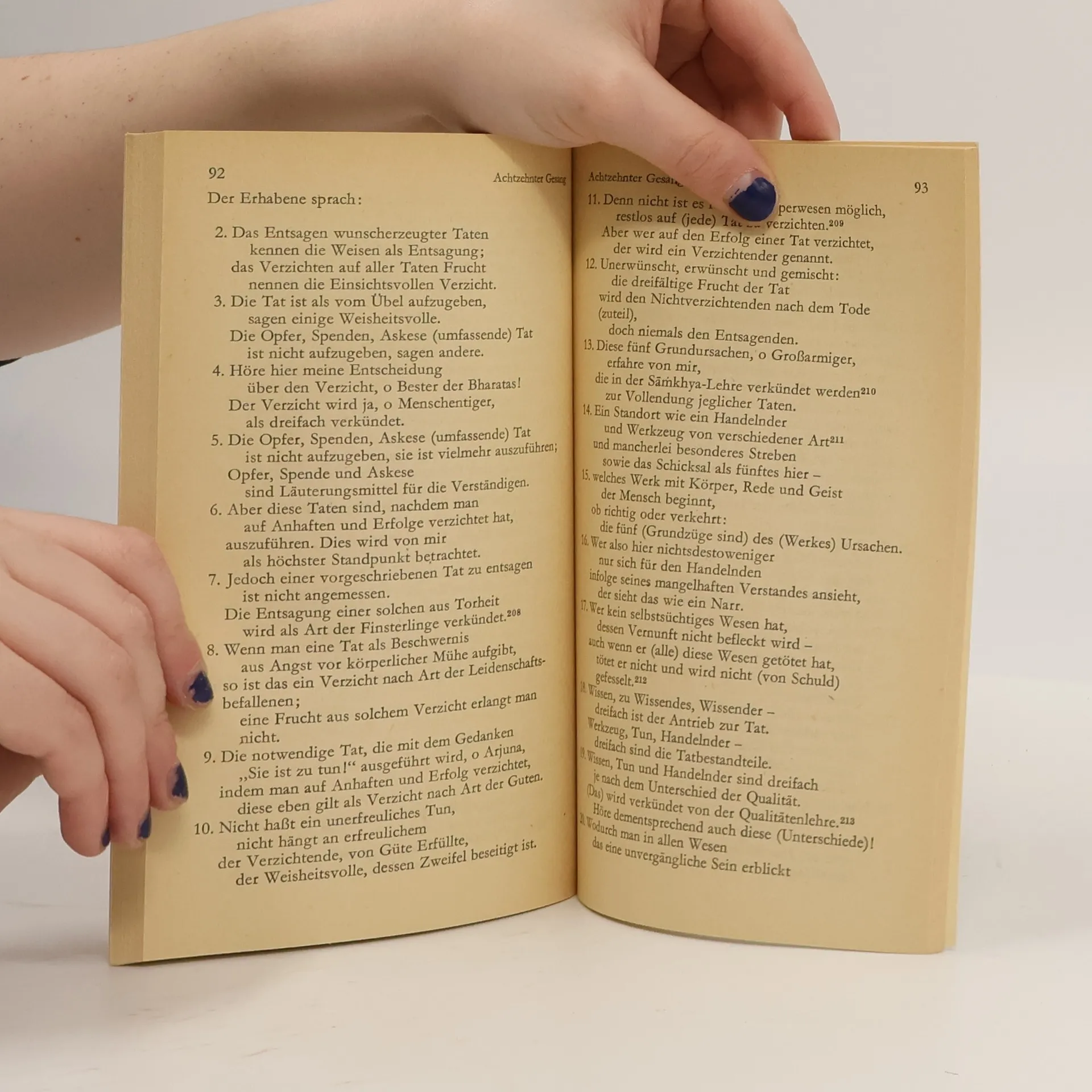 Ein heiliger Text des HinduismusKrischna, der Erhabene (bhagavat) wendet sich in 18 Gesängen (g¦ta) an den jungen Arjuna, der davor zurückschreckt, in einem Krieg gegen seine Verwandten anzutreten. Das berühmte Werk zählt zu den zentralen heiligen Texten des Hinduismus und fordert selbstloses Handeln, hingebungsvolle Liebe und den Willen nach Erkenntnis.