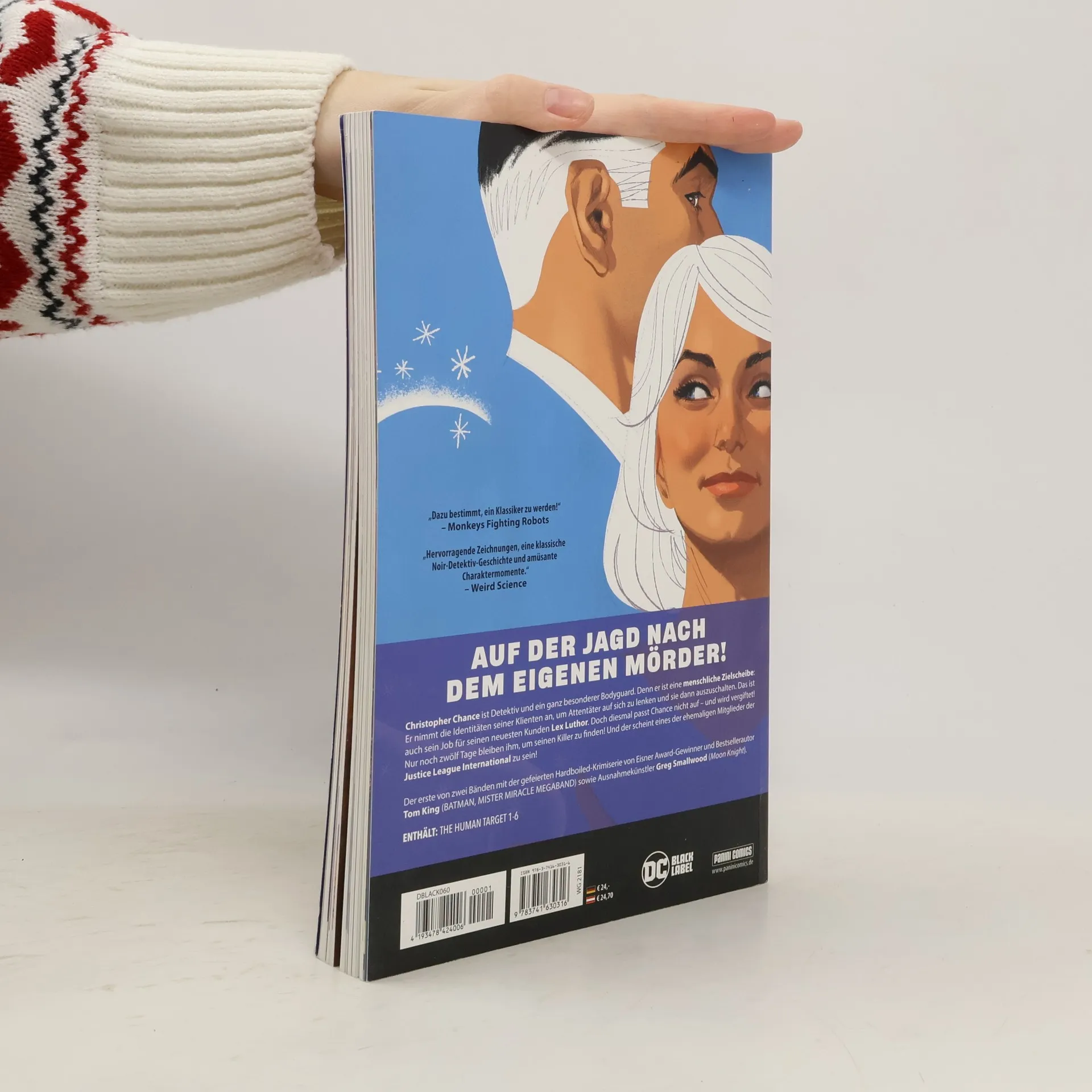 AUF DER JAGD NACH DEM EIGENEN MÖRDER! Christopher Chance ist Detektiv und ein ganz besonderer Bodyguard. Denn er ist eine menschliche Zielscheibe: Er nimmt die Identitäten seiner Klienten an, um Attentäter auf sich zu lenken und sie dann auszuschalten. Das ist auch sein Job für seinen neuesten Kunden Lex Luthor! Doch diesmal passt Chance nicht auf – und wird vergiftet! Nur noch zwölf Tage bleiben ihm, um seinen Killer zu finden! Und der scheint eines der ehemaligen Mitglieder der Justice League International zu sein! Der erste von zwei Bänden mit der gefeierten Hardboiled-Krimiserie von Eisner Award-Gewinner und Bestsellerautor Tom King (BATMAN, MISTER MIRACLE MEGABAND) sowie Ausnahmekünstler Greg Smallwood (Moon Knight). ENTHÄLT: THE HUMAN TARGET 1-6