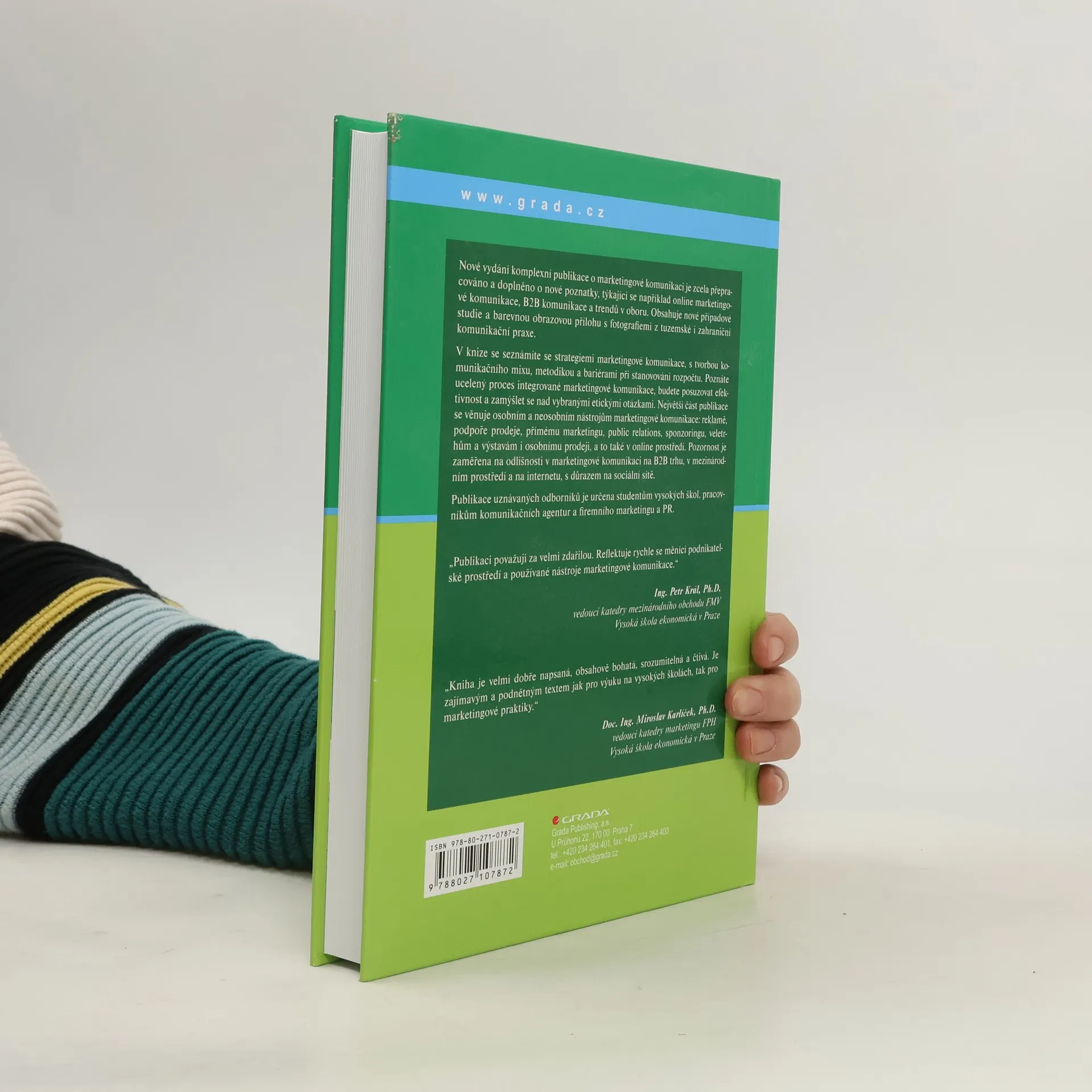 Nové vydání komplexní publikace o marketingové komunikaci je zcela přepracováno a doplněno o nové poznatky, týkající se například online marketingové komunikace, B2B komunikace a trendech v oboru. Obsahuje nové případové studie a barevnou obrazovou přílohu s fotografiemi z tuzemské i zahraniční komunikační praxe. V knize se seznámíte se strategiemi marketingové komunikace, s tvorbou komunikačního mixu, metodikou a bariérami při stanovování rozpočtu. Poznáte ucelený proces integrované marketingové komunikace, budete posuzovat efektivnost a zamýšlet se nad vybranými etickými otázkami. Největší část publikace se věnuje osobním a neosobním nástrojům marketingové komunikace: reklamě, podpoře prodeje, přímému marketingu, public relations, sponzoringu, veletrhům a výstavám i osobnímu prodeji, a to také v online prostředí. Pozornost je zaměřena na odlišnosti v marketingové komunikaci na B2B trhu, v mezinárodním prostředí a na internetu, s důrazem na sociální sítě. Publikace uznávaných odborníků je určena studentům vysokých škol, pracovníkům komunikačních agentur a firemního marketingu a PR.