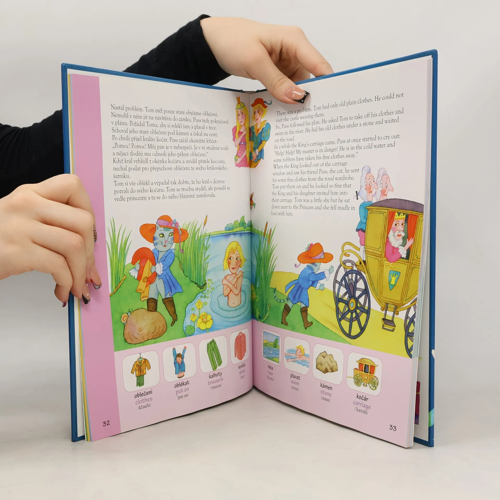 Na stránkách příjemně ilustrované knížky se děti setkají s kohoutkem a slepičkou, kouzelným obuškem, Kocourem v botách, Čertem a Káčou, vejcem, které šlo na vandr, s Budulínkem, třemi malými prasátky a velikou řepou. Bilingvní text pohádek v češtině a angličtině doplňuje na každé stránce obrázkový slovníček, v závěru knížky je zařazen abecední anglicko-český slovník s přepisem výslovnosti.