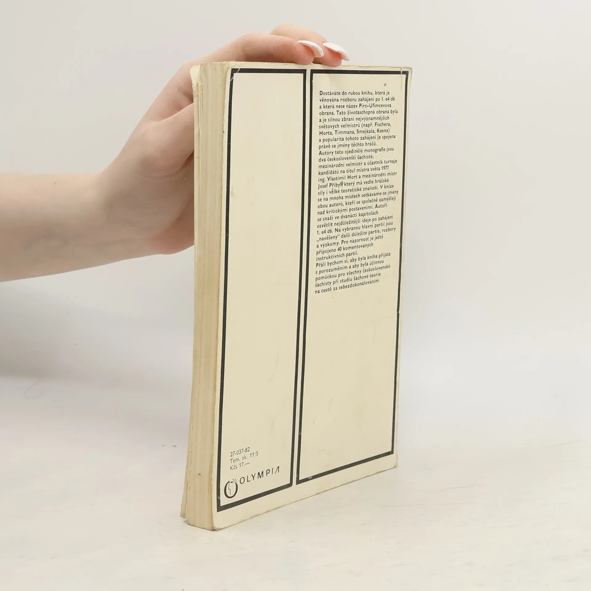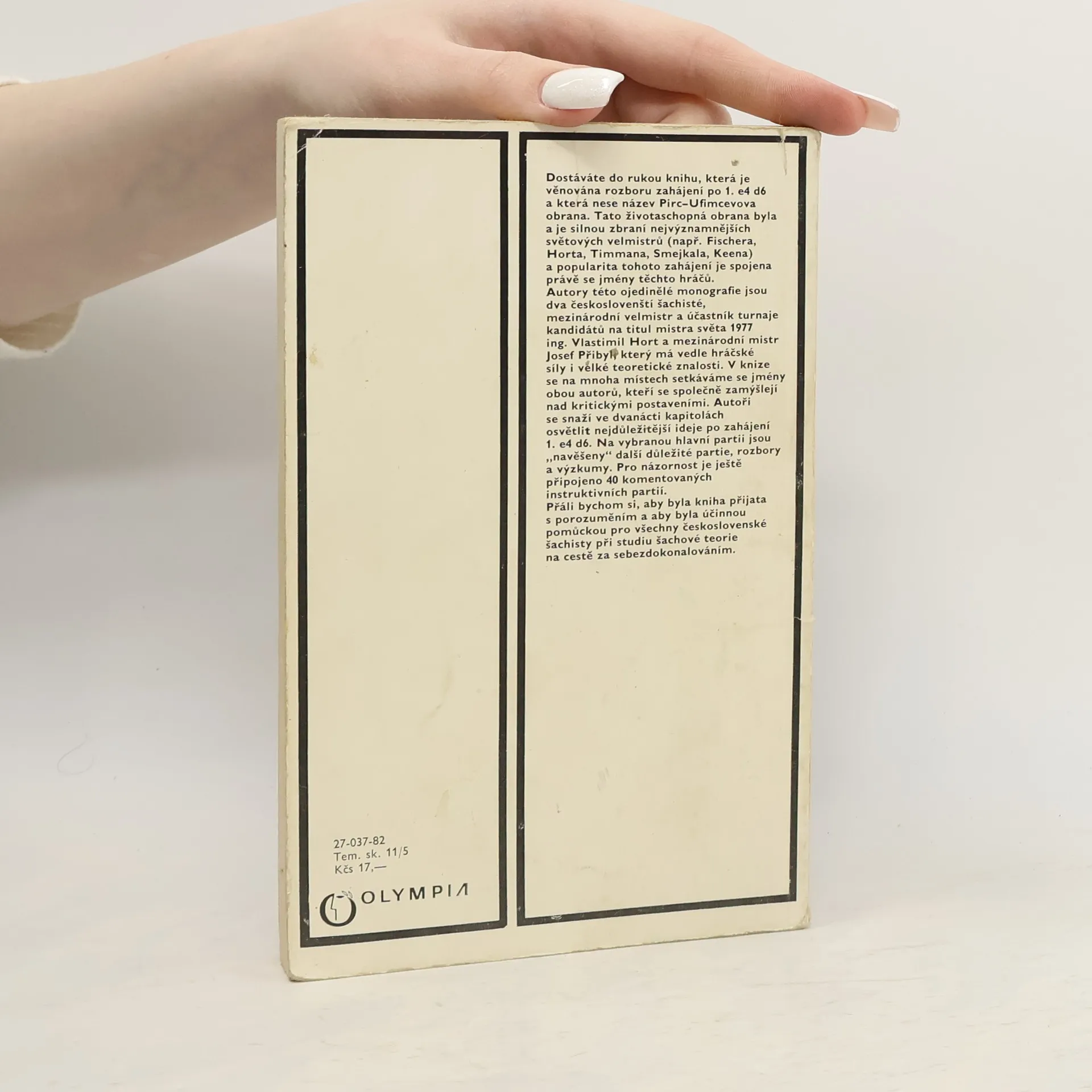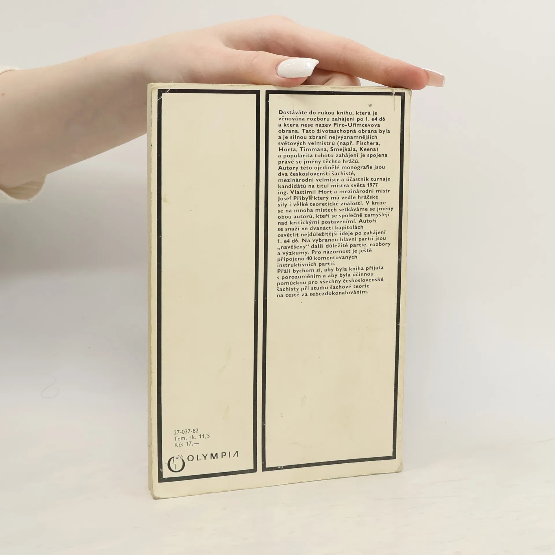 Tato životaschopná obrana byla a je dnes silnou zbraní nejvýznamnějsích světových velmistrů (např. Fischera, Horta, Timmana, Smejkala, Keena) a popularita tohoto zahájení je spojena právě se jmény těchto hráčů. Autory této ojedinělé monografie jsou dva českoslovenští šachisté, mezinárodní velmistr a účastník turnaje kandidátů na titul mistra světa 1977 ing. Vlastimil Hort a mezinárodní mistr Josef Přibyl, který má vedle hráčské síly i velké teoretické znalosti. V knize se na mnoha místech setkáváme se jmény obou autorů, kteří se společně zamýšlejí nad kritickými postaveními. Autoři se snaží ve dvanácti kapitolách osvětlit nejdůležitější ideje po zahájení t. e4 d6. Na vybranou hlavní partii jsou „navěšeny" další důležité partie, rozbory a výzkumy. Pro názornost je ještě připojeno 40 komentovaných instruktivních partií. Přáli bychom si, aby byla kniha přijata s porozuměním a aby byla účinnou pomůckou pro všechny československé šachisty při studiu šachové teorie na cestě za sebezdokonalováním.