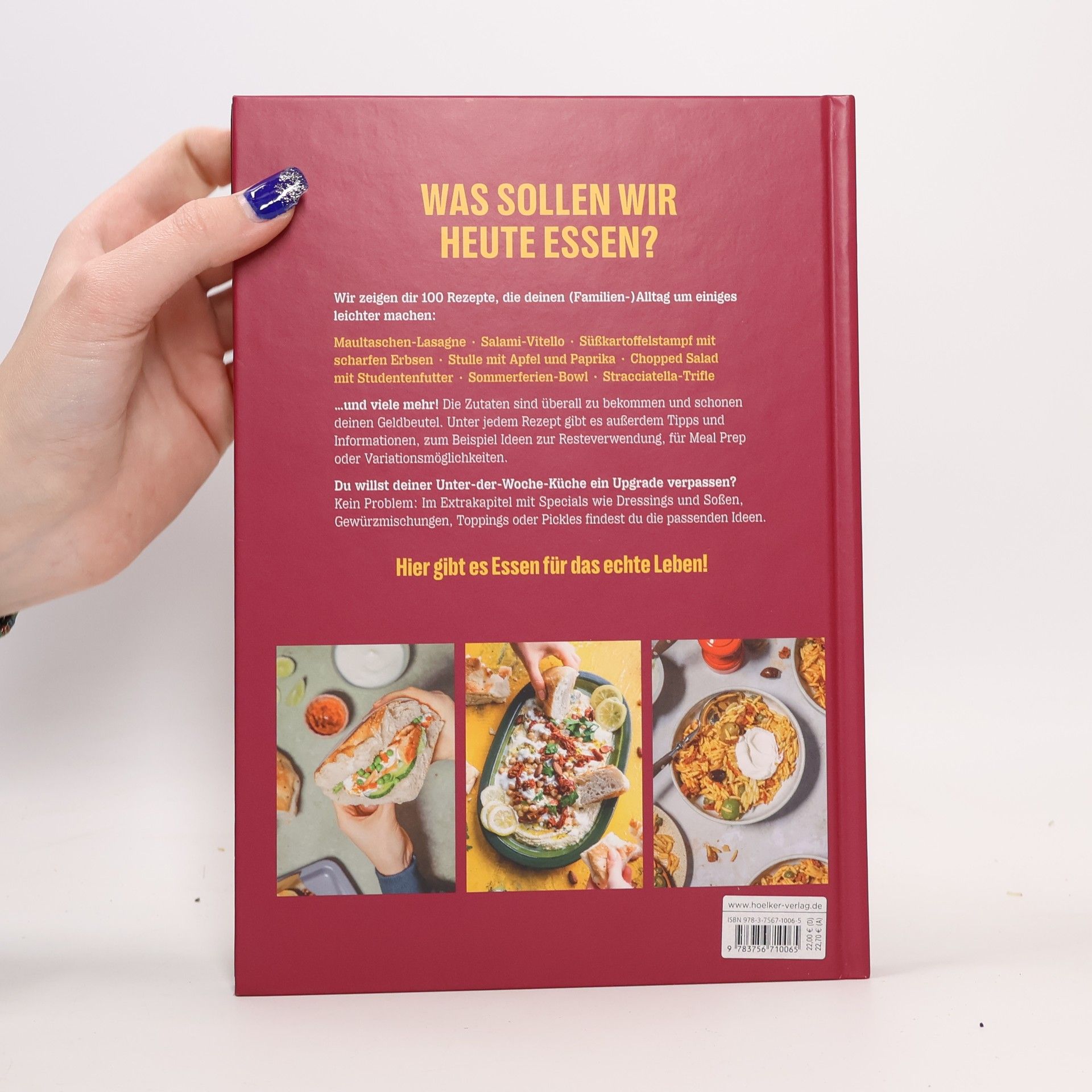 Was sollen wir nur heute essen? Dieses Buch zeigt dir über 100 Rezepte, die deinen (Familien-)Alltag um einiges leichter machen: • Maultaschen-Lasagne • Zitronige Kichererbsen-Orzo-Suppe • Teriyaki-Lachs-Döner • Tomaten-Gerste-Grünkohl-Eintopf • Salami-Vitello • Warmer Kürbis-Trauben-Salat vom Blech • Süßkartoffelstampf mit scharfen Erbsen • Kabeljau mit Brezn-Bordelaise • Stulle mit Apfel und Paprika • Chopped Salad mit Studentenfutter • Sommerferien-Bowl • Panzanella Two Ways • Stracciatella-Trifle Und viele mehr! Alle Zutaten sind überall zu bekommen und schonen deinen Geldbeutel. Unter jedem Rezept gibt es außerdem Tipps und Informationen, zum Beispiel Ideen zur Resteverarbeitung, für Meal Prep oder Variationsmöglichkeiten. Du willst deiner Unter-der-Woche-Küche ein Upgrade verpassen? Kein Problem: Im Extrakapitel mit Specials wie Dressing und Soßen, Gewürzmischungen, Toppings oder Pickles findest du die passenden Ideen. Hier gibt es Essen für das echte Leben!