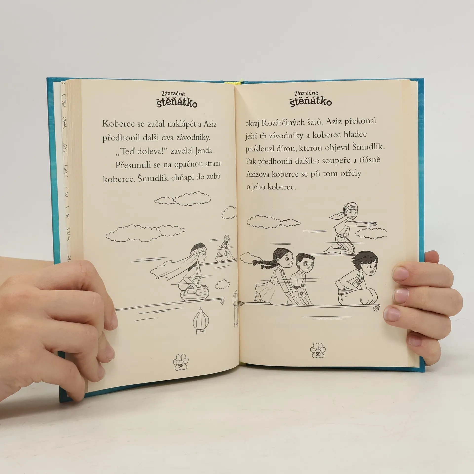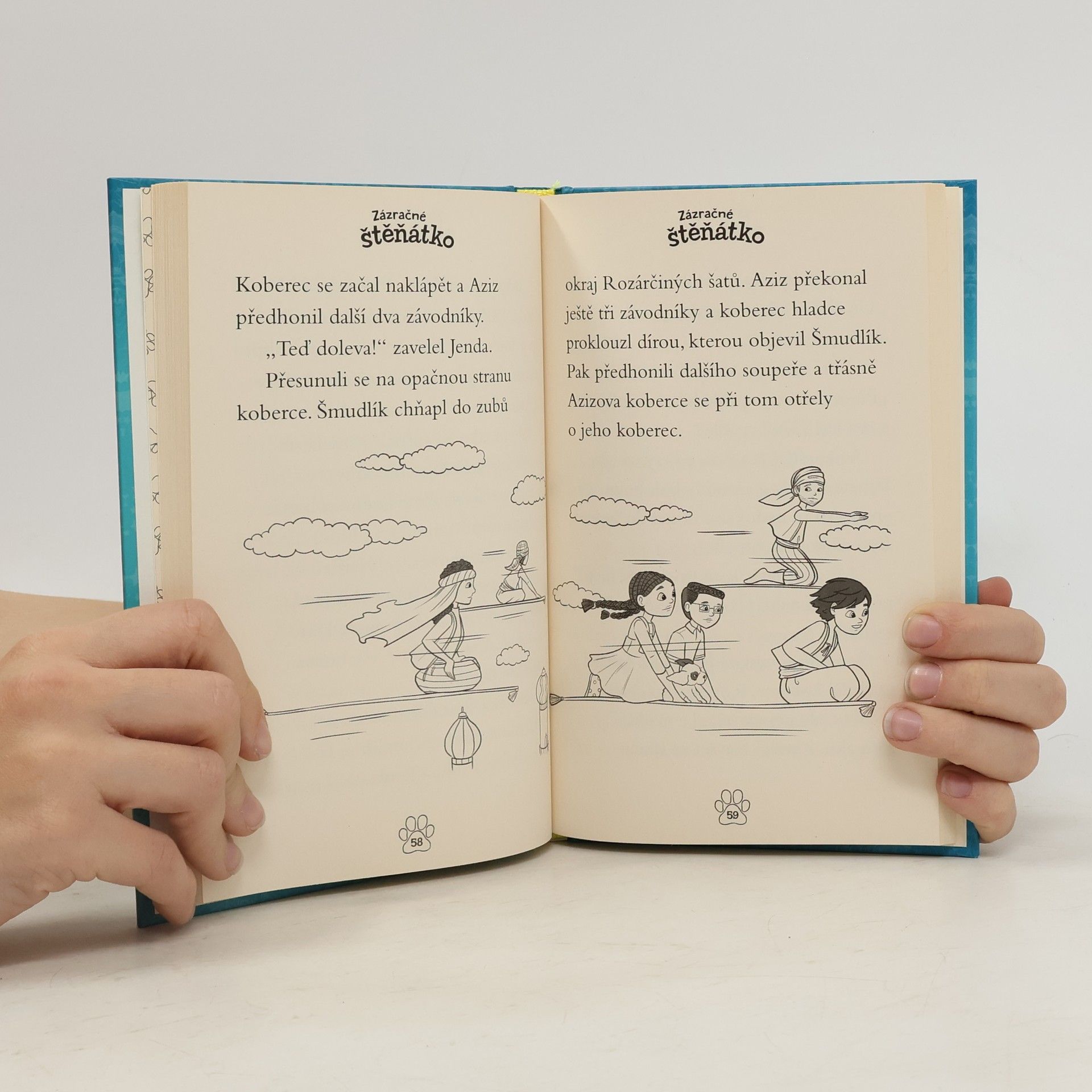 Rozárka s Jendou jsou u svého dědečka na chatě, pořád jen vytrvale prší. Když k nim jako na zavolanou přiběhne roztomilé a nezbedné štěně, je o zábavu postaráno. Šmudlíka baví skákat v kalužích, ale především umí kouzlit. Vezme děti na nezapomenutelný výlet až do daleké Persie, kde poznají místní princeznu a také nového kamaráda Azize. Ten si nejvíc ze všeho přeje vyhrát závod na létajících kobercích. Podaří se mu to nakonec za pomoci Rozárky, Jendy a Šmudlíka?