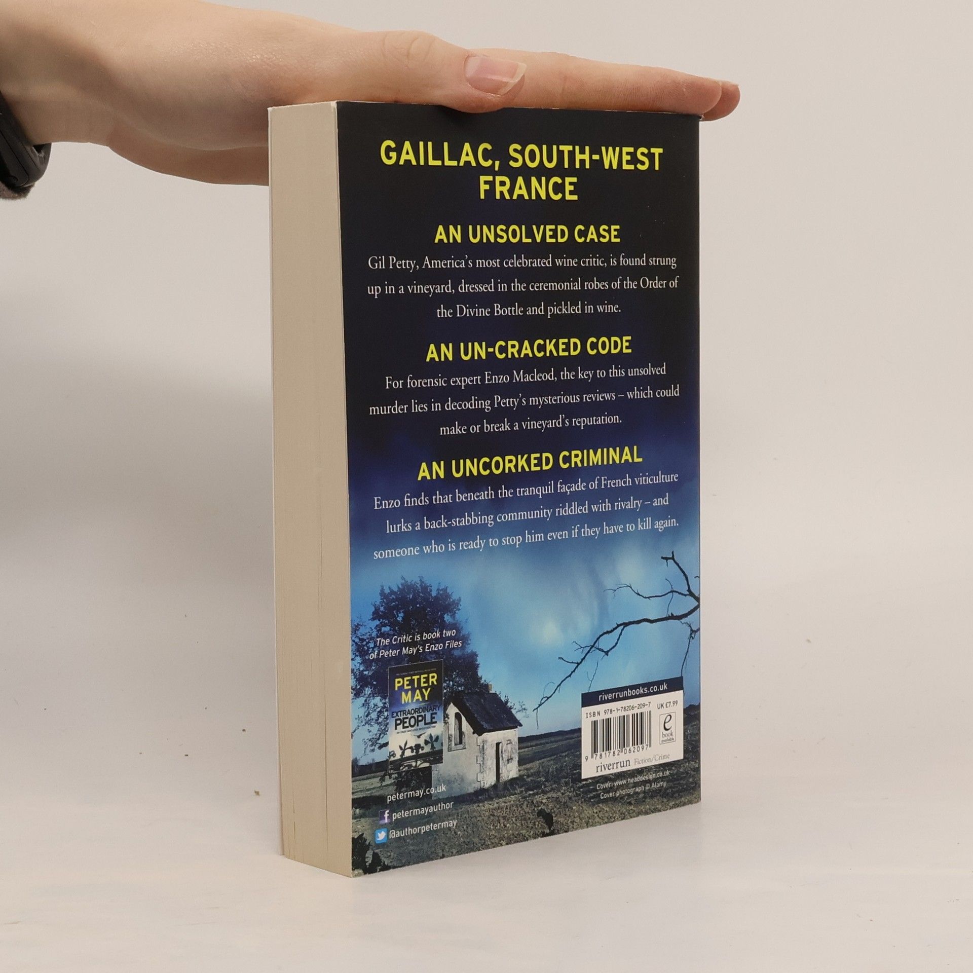 GAILLAC, SOUTH-WEST FRANCE. An unsolved case. Gil Petty, America's most celebrated wine critic, is found strung up in a vineyard, dressed in the ceremonial robes of the Order of the Divine Bottle and pickled in wine. An un-cracked code. For forensic expert Enzo Macleod, the key to this unsolved murder lies in decoding Petty's mysterious reviews - which could make or break a vineyard's reputation. An uncorked criminal. Enzo finds that beneath the tranquil façade of French viticulture lurks a back-stabbing community riddled with rivalry - and someone who is ready to stop him even if they have to kill again. LOVE PETER MAY? Order his new thriller, A WINTER GRAVE