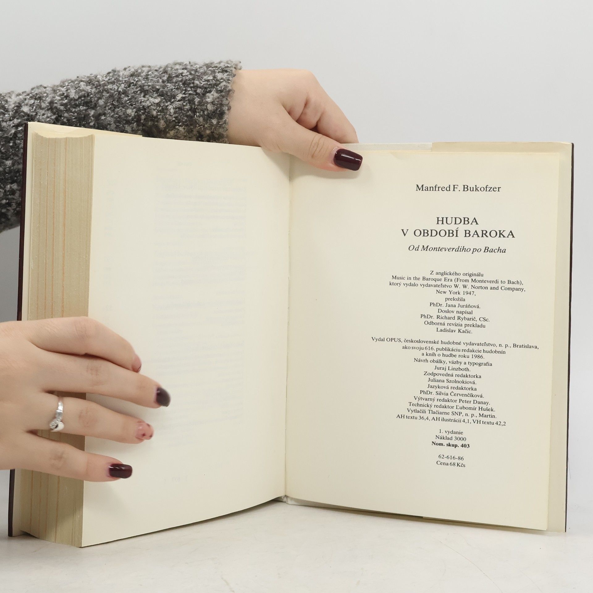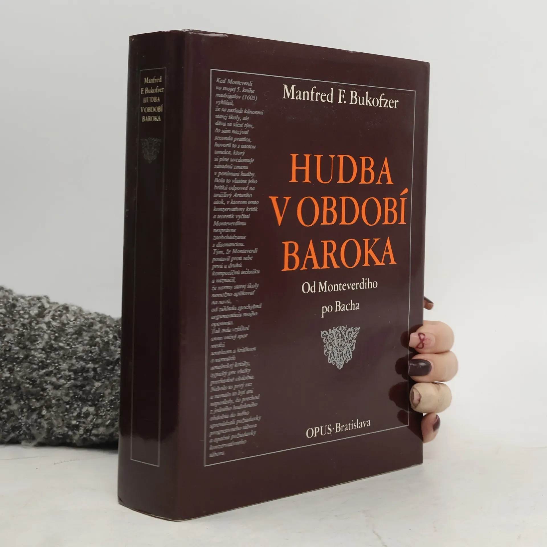 Manfred F. Bukofzer (1910 – 1955), americký hudobný vedec nemeckého pôvodu patril medzi pozoruhodné osobnosti muzikológie nášho storočia. Vo svojej knihe Hudba v období baroka skúma na základe dôvernej znalosti rozsiahleho hudobného materiálu evolučné zmeny, ktoré viedli ku kryštalizácii typicky barokových čŕt v hudbe. V prehľadne členených kapitolách sa zoberá vznikom nového štýlu v Taliansku a jeho rozšírením do severských krajín, národnými modifikáciamai barokového štýlu a ich vzájomným vplyvom. Sleduje zrod a vývin opery, balety, koncertu, rôznych hudobných techník a foriem. Samostatné kapitoly venuje vrcholovým tvorcom neskorého baroka – J. S. Bachovi a G. F. Händlovi –, ako aj sociálnemu zázemiu barokovej hudby. Knihu dopĺňajú bibliografia a registre.