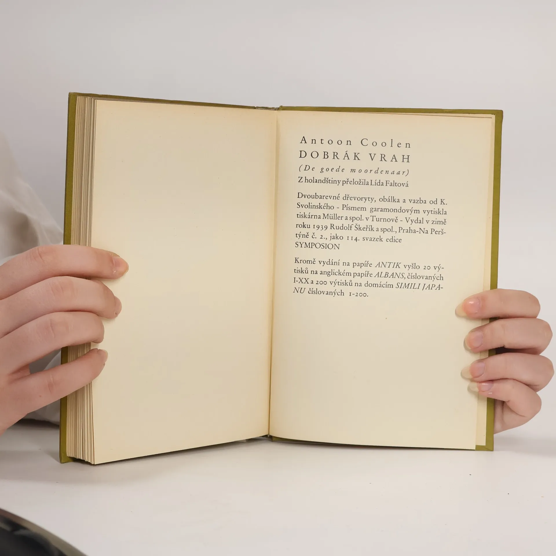 Román. Kromě vyd. na papíře Antik vyšlo 20 výt. na anglické papíře Albans, čísl. I-XX a 200 výt. na domácím Simili japanu čísl. 1-200.
