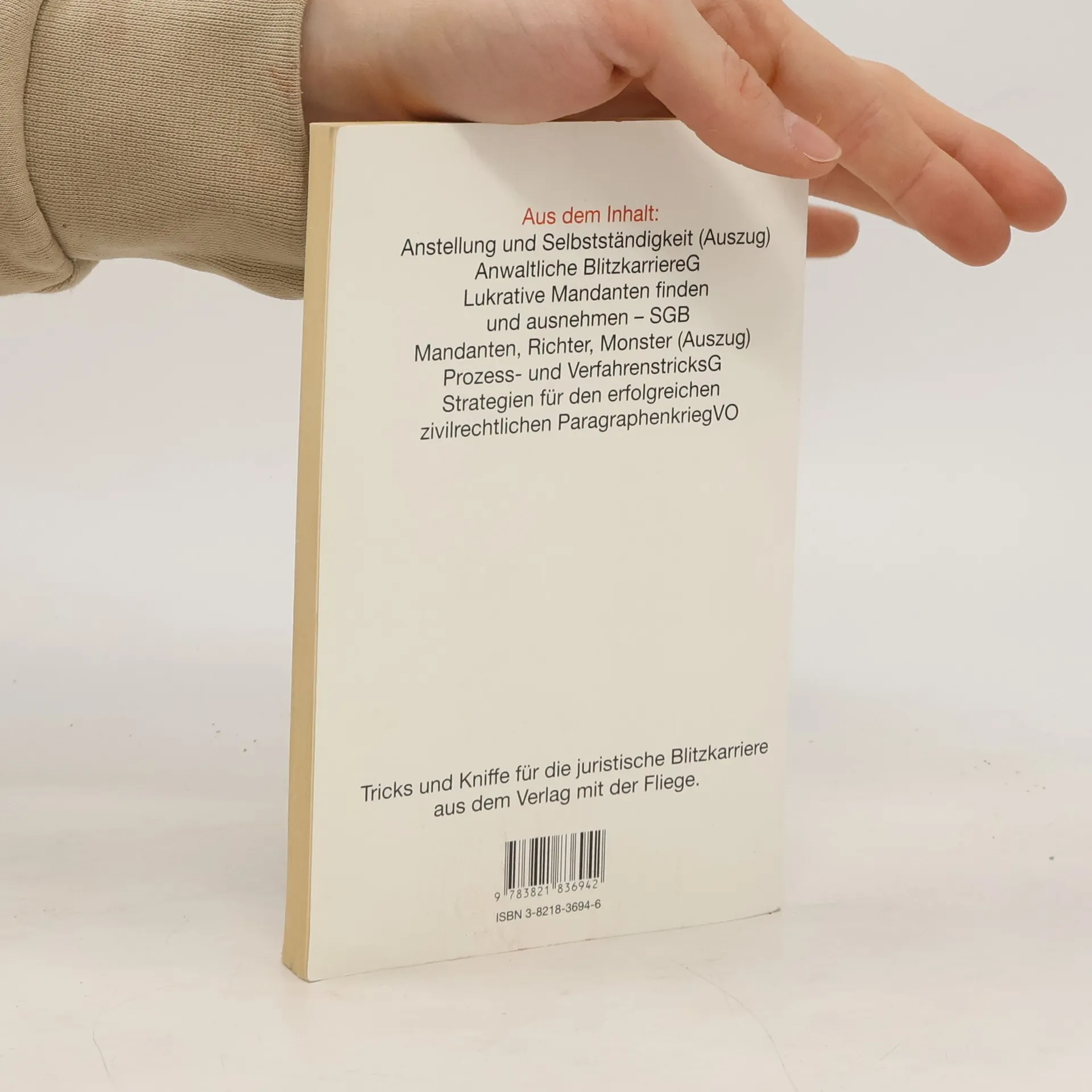 Eine Sensation: Ein Jurist, der seine Pappenheimer kennt, schaut der Branche auf die Finger und verrät, wie man mit Tricks, unkonventionellen Methoden und einer gehörigen Portion Selbstherrlichkeit bis Ende nächster Woche zum Staranwalt wird. Endlich wird der hiesigen Schwemme von Stud. jurs., Assessoren und erfolglosen Einzelkämpfern geholfen: Mit böser Zunge, ironisch und sarkastisch werden alle Tricks und Kniffe der Staranwälte hart an der Grenze und jenseits der Strafbarkeit beim Namen genannt. Was außer einem imposanten Briefbogen, einer Million Startkapital, dem Abwerfen von Werbebroschüren über Justitzvollzugsanstalten und dem richtigem Umgang mit den Journalisten noch notwendig ist, erfährt der Leser in einem wahrhaft ketzerischen Meisterwerk, das seinesgleichen sucht.