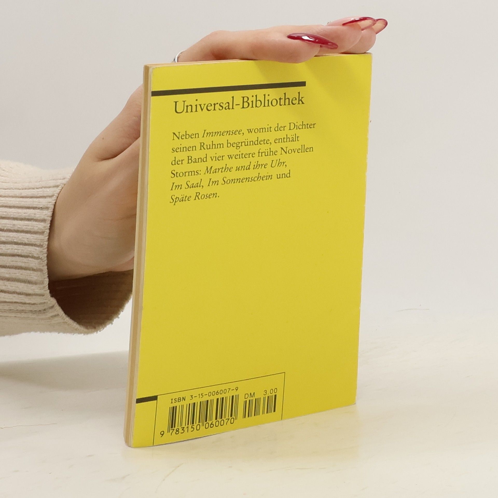 Neben »Immensee«, womit der Dichter seinen Ruhm begründete, enthält der Band vier weitere frühe Novellen Storms: »Marthe und ihre Uhr«, »Im Saal«, »Im Sonnenschein« und »Späte Rosen«.