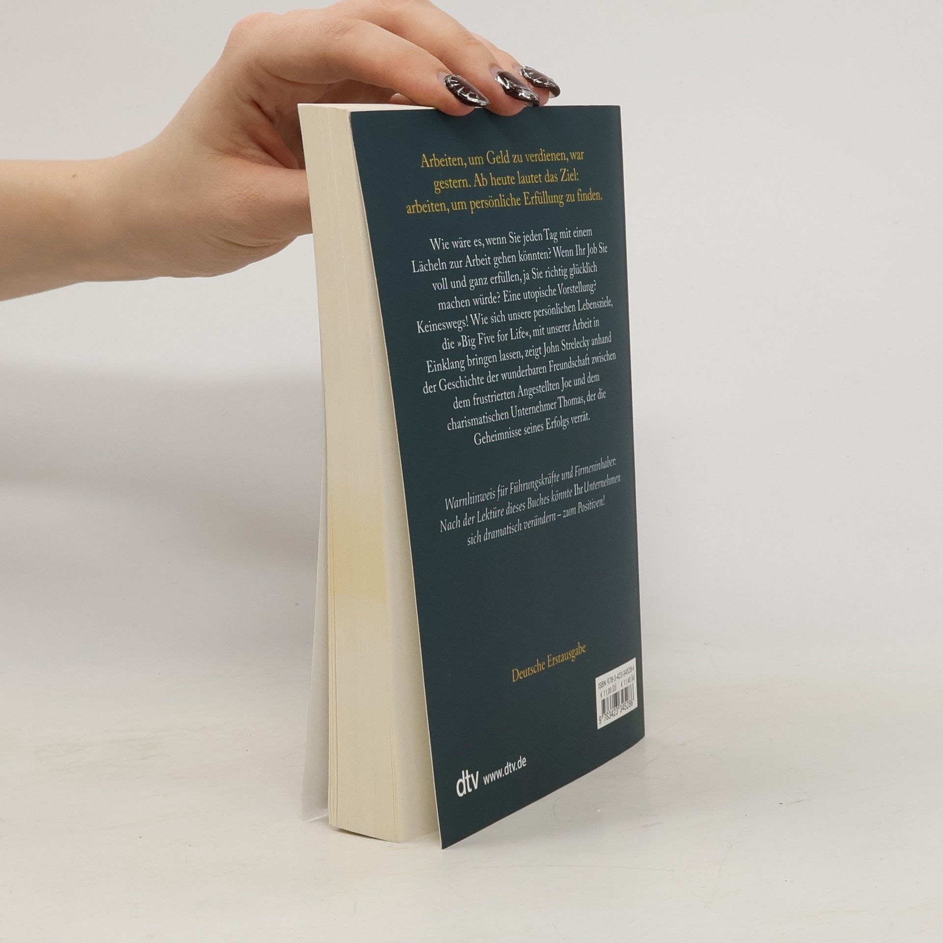 Arbeiten, um Geld zu verdienen, war gestern Durch Zufall lernt Joe, ein mit seinem Job unzufriedener Angestellter, den charismatischen Geschäftsmann Thomas kennen. Rasch entwickelt sich eine tiefe Freundschaft zwischen den beiden Männern. Thomas wird zu Joes Mentor und offenbart ihm die Geheimnisse seines Erfolgs. Er zeigt Joe, wie wichtig es ist, auch in der Arbeit erfüllt zu sein. Seine Unternehmen führt Thomas anhand zweier Leitlinien: Jeder Mitarbeiter muss seine Bestimmung sowie seine »Big Five for Life« kennen, also wissen, welche fünf Ziele er im Leben erreichen will. Diese Ideen helfen Joe, seine Wünsche zu verwirklichen. Doch Thomas will möglichst viele an seinem Wissen teilhaben lassen: Seine gesammelten Aufzeichnungen liegen hier vor Ihnen. Arbeiten, um Geld zu verdienen, war gestern. Ab heute lautet das Ziel: arbeiten, um persönliche Erfüllung zu finden.