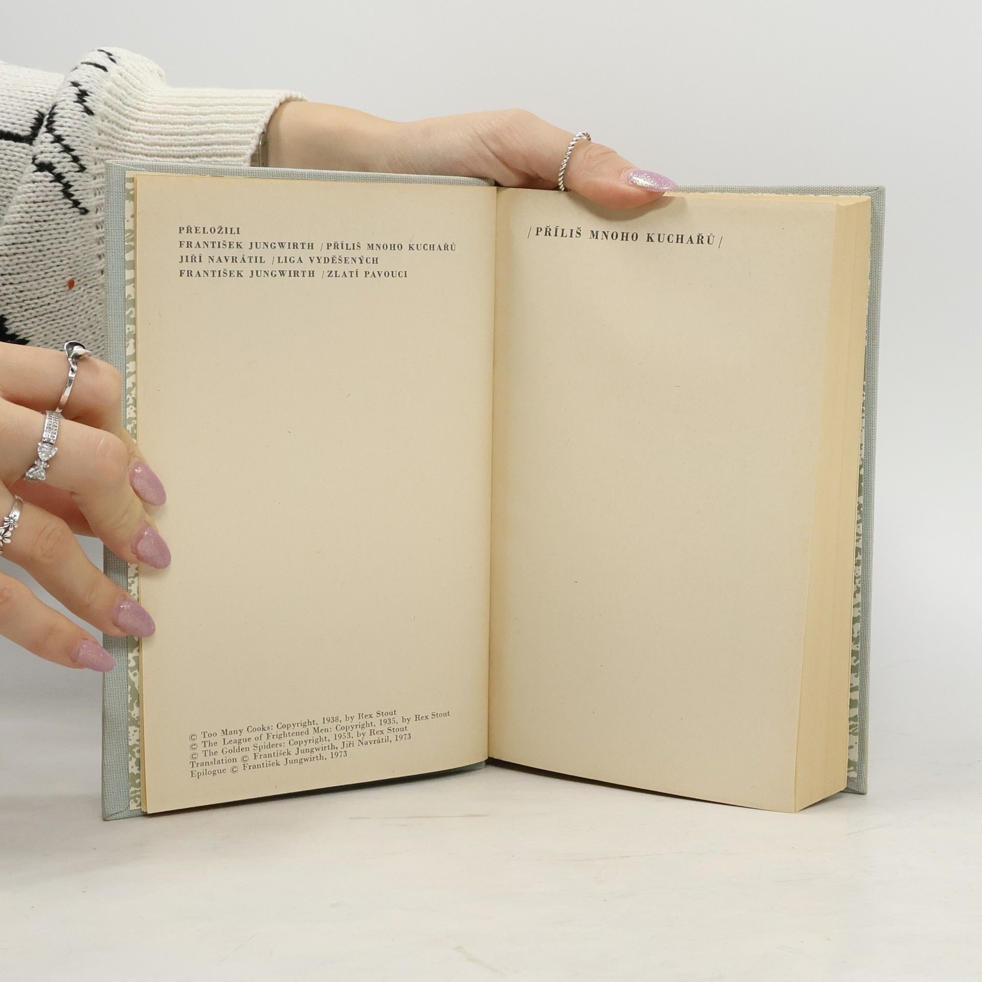 Tři detektivní romány úspěšného amerického detektivkáře (nar. 1886), individuálně spojujícího principy tzv. „drsné školy", zavádějí do amerického prostředí dvacátých až padesátých let a vystupuje v nich řada společných postav Wolfovy detektivní agentury v čele s detektivem, milovníkem orchidejí Wolfem a jeho sekretářem a tělesným strážcem Goodwinem. Příběhy se vyznačují originalitou kresby prostředí a překvapivým logickým rozuzlením. Obsahuje: Příliš mnoho kuchařů (5. kniha série Nero Wolfe) -- Liga vyděšených -- Zlatí pavouci