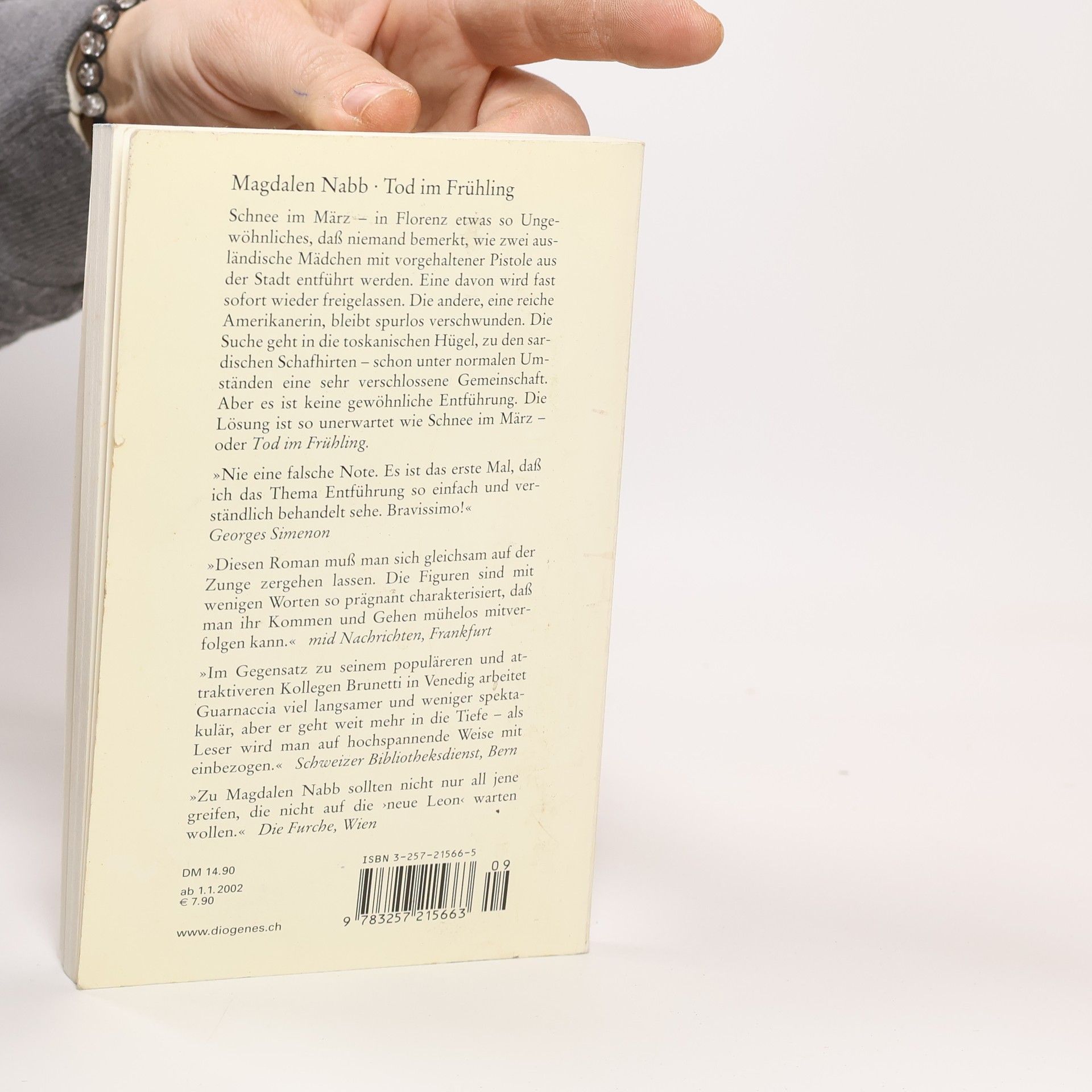 Schnee im März ­ in Florenz etwas so Ungewöhnliches, daß niemand bemerkt, wie zwei ausländische Mädchen mit vorgehaltener Pistole aus der Stadt entführt werden. Eine davon wird fast sofort wieder freigelassen. Die andere, eine reiche Amerikanerin, bleibt spurlos verschwunden. Die Suche geht in die toskanischen Hügel, zu den sardischen Schafhirten ­ schon unter normalen Umständen eine sehr verschlossene Gemeinschaft. Aber es war keine gewöhnliche Entführung. Die Lösung ist so unerwartet wie Schnee im März ­ oder Tod im Frühling.