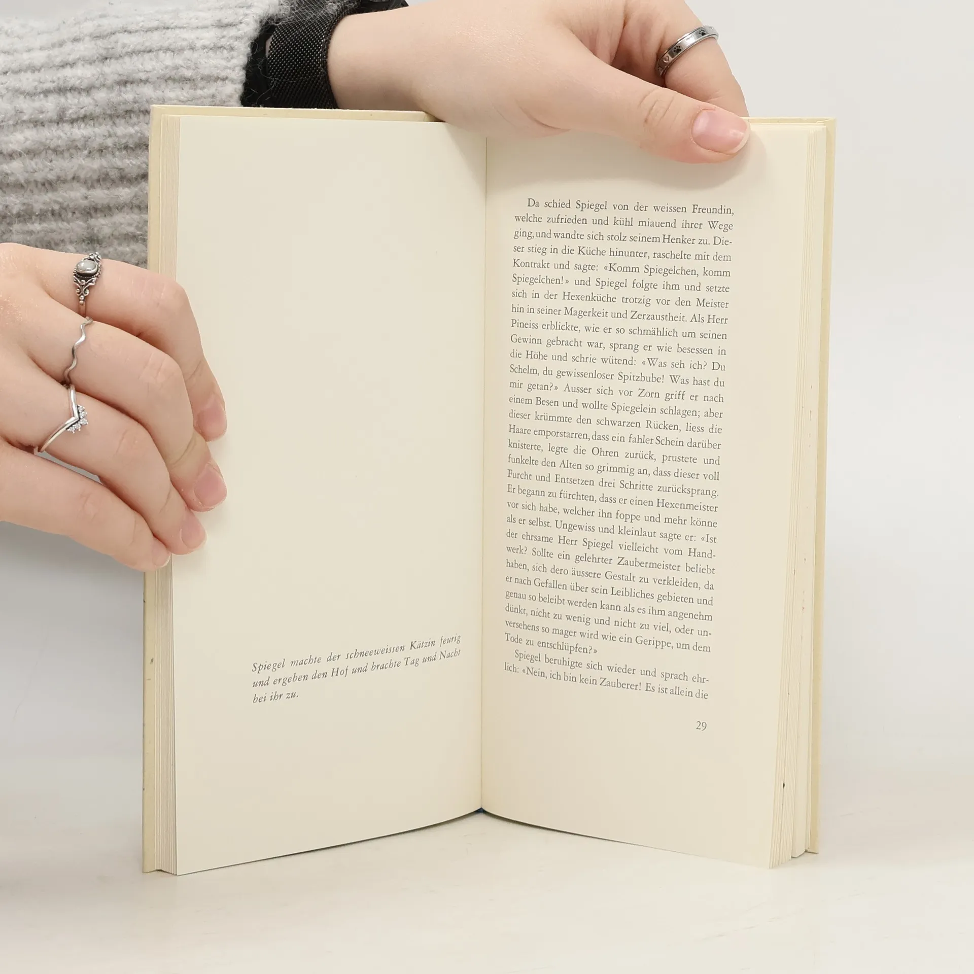 Spiegel, das Kätzchen, ist ein naher Verwandter des Gestiefelten Katers und E. T. A Hoffmanns Kater Murr: schlau, eloquent und dem Genuss nicht abgeneigt. Doch zunächst gerät es halb verhungert in die Fänge von Pineiss, dem Hexenmeister der Stadt. Mit ihm schließt es einen Pakt: Für einige Monate, verspricht Pineiss, werde er das Kätzchen mit ausgesuchten kulinarischen Köstlichkeiten verwöhnen, danach aber bekomme er dessen Balg zur beliebigen Verwertung. Spiegel rettet seine Haut mit einer Liebesgeschichte.