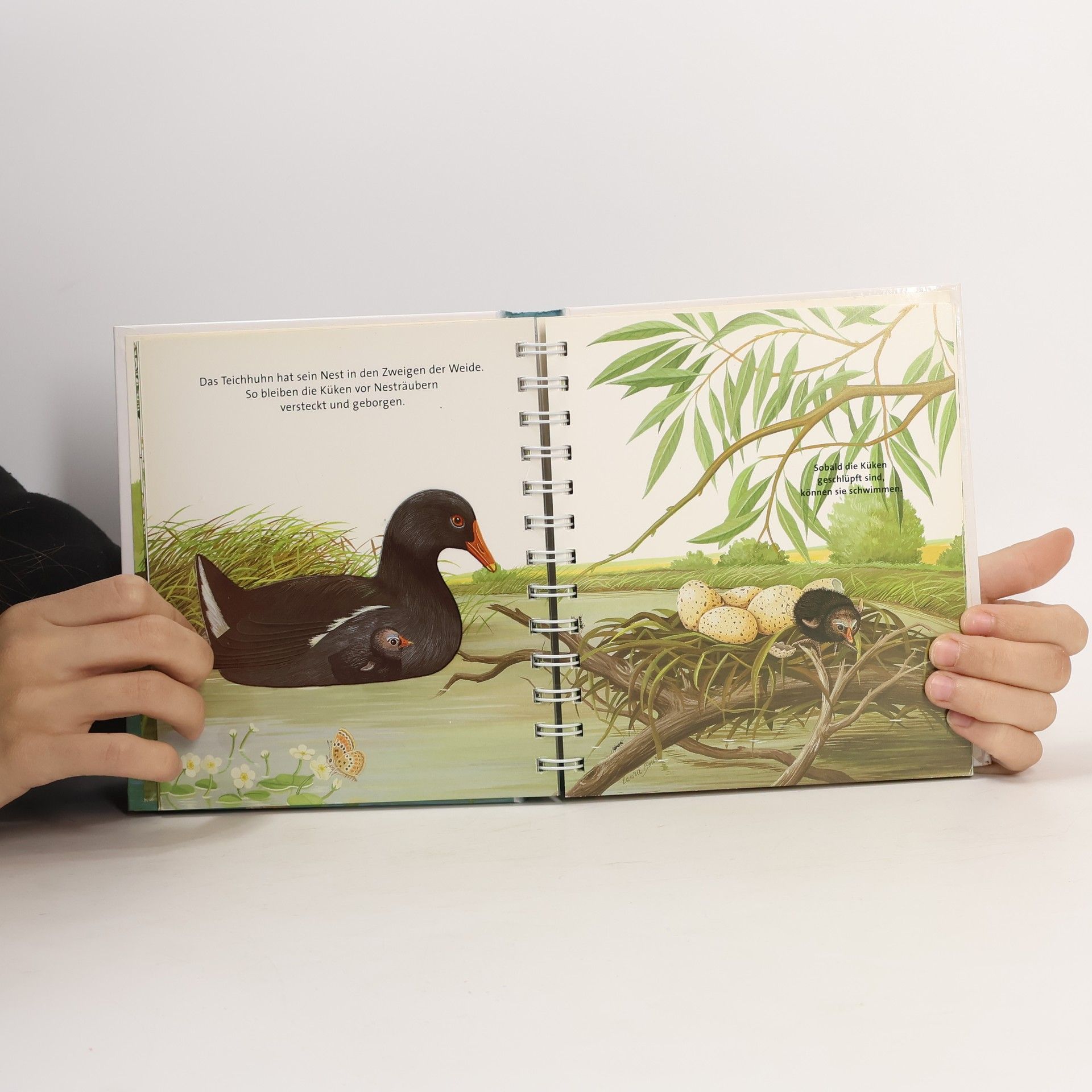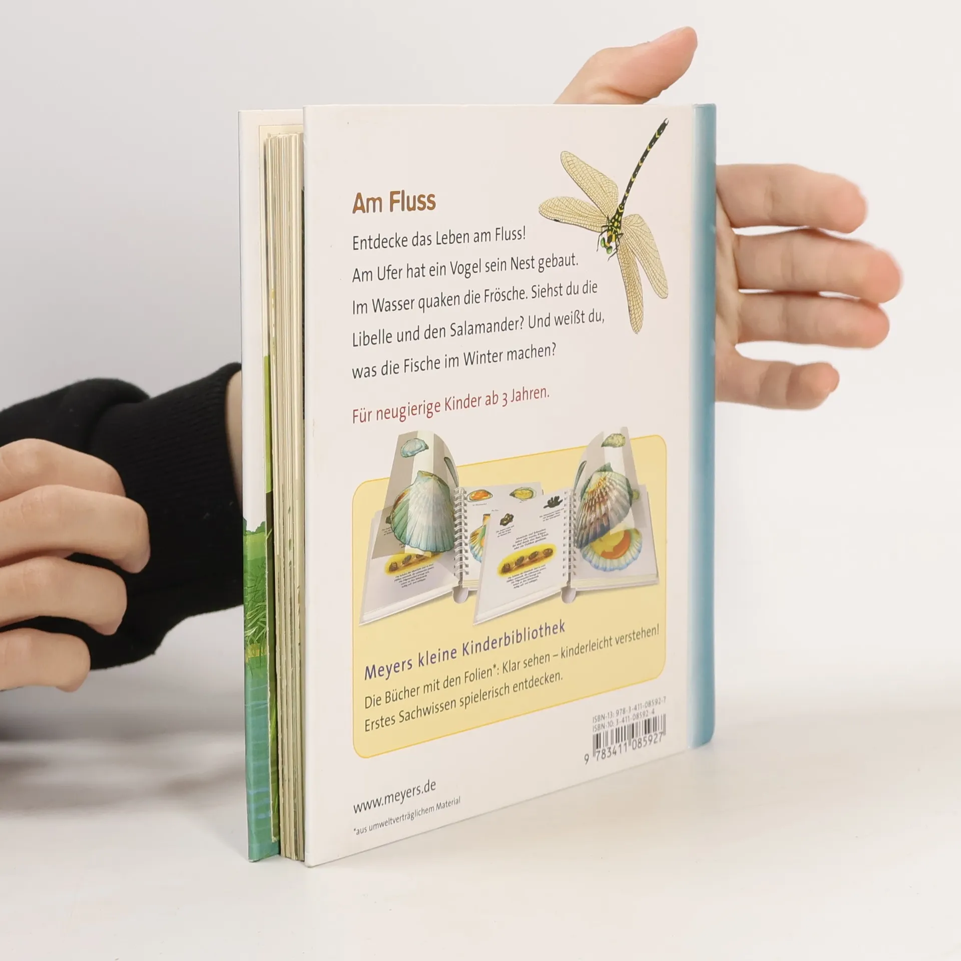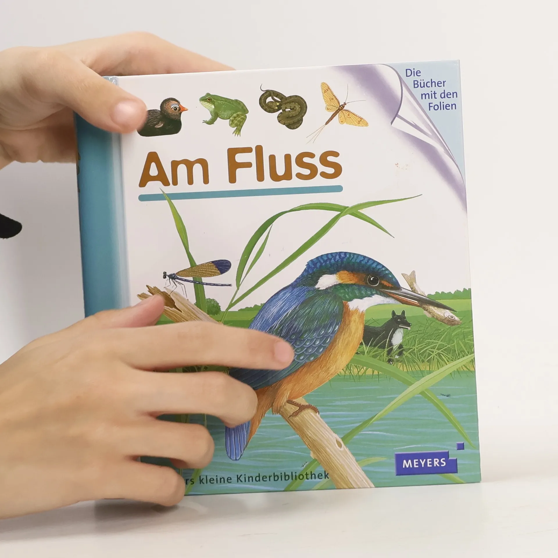 Durch spannende Effekte vermittelt die Bilderbuchreihe „Meyers kleine Kinderbibliothek“ erstes Sachwissen für Kinder ab 3 Jahren. Transparente Folien zeigen beim Umblättern das Innenleben von Dingen, machen Verdecktes sichtbar oder veranschaulichen Veränderungen. In diesem Band werden das Leben am Fluss und die dort lebenden Tiere wie Libellen, Frösche, Salamander oder Fische auf kindgerechte Weise vorgestellt.