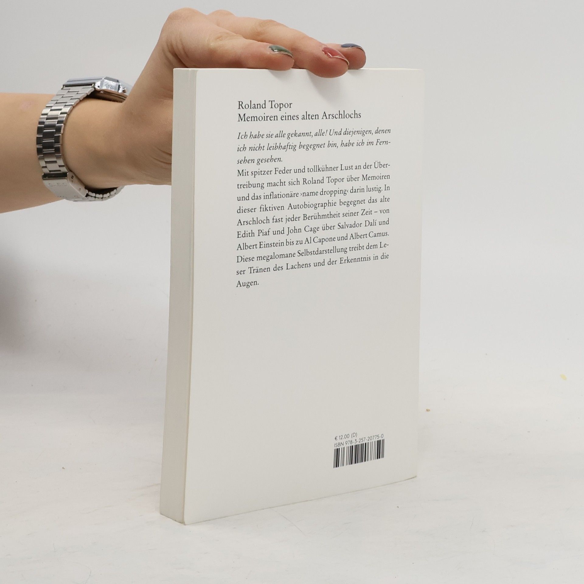 Mit spitzer Feder und tollkühner Lust an der Übertreibung macht sich Roland Topor über Memoiren und das inflationäre ›name dropping‹ darin lustig. In dieser fiktiven Autobiographie begegnet das alte Arschloch fast jeder Berühmtheit seiner Zeit – von Édith Piaf und John Cage über Salvador Dalí und Albert Einstein bis zu Al Capone und Albert Camus. Diese megalomane Selbstdarstellung treibt dem Leser Tränen des Lachens und der Erkenntnis in die Augen.