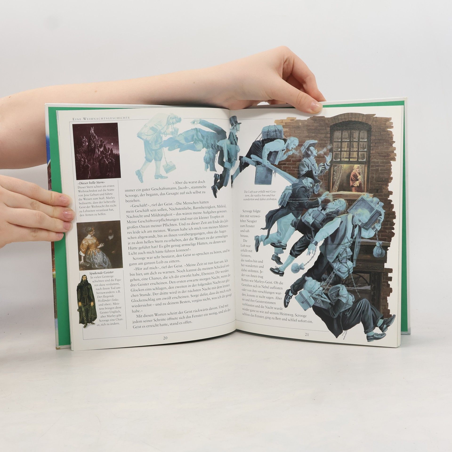 Scrooge, der weder Mitleid noch Zuneigung für seine Mitmenschen empfindet und nur sein Geld liebt, verkörpert all das, was Dickens an der Gesellschaft seiner Zeit hasste. Die Geister sind der Gegenpol zu Scrooges Egoismus – die Verkörperungen des »Geistes des Weihnachtsfestes«, nämlich Liebe, Freude und Mitleid. Dickens schrieb Eine Weihnachtsgeschichte 1843, um seine Zeitgenossen auf die Lebensbedingungen der ärmeren Bevölkerung aufmerksam zu machen. Parallel zur Geschichte informieren zahlreiche Abbildungen, Illustrationen und kurze Texte darüber, wie die Menschen damals gekleidet waren, was sie aßen und welche Gewohnheiten sie hatten. Unter Beibehaltung von Stil und Atmosphäre wurde der Text gekürzt und sprachlich vereinfacht, so dass Kinder ab zehn Jahren ihn gut verstehen können.