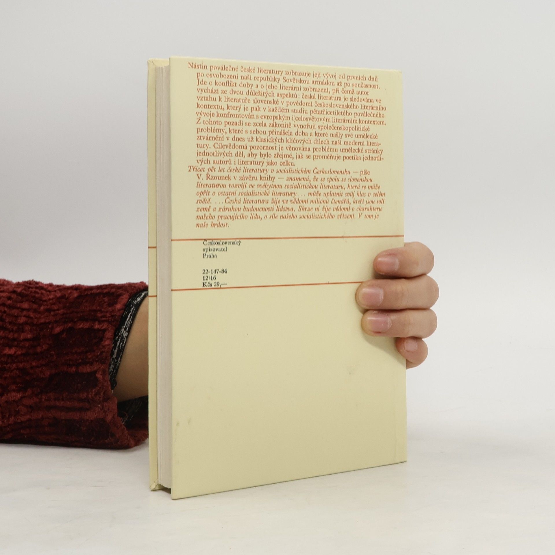Nástin poválečné české literatury zobrazuje její vývoj od prvních dnů po osvobození naší republiky Sovětskou armádou až po současnost. Jde o konflikt doby a o jeho literární zobrazení, při čemž autor vychází ze dvou důležitých aspektů: česká literatura je sledována ve vztahu k literatuře slovenské v povědomí československého literárního kontextu, který je pak v každém stadiu pětatřicetiletého poválečného vývoje konfrontován s evropským i celosvětovým literárním kontextem. Z tohoto pozadí se zcela zákonitě vynořují společenskopolitické problémy, které s sebou přinášela doba a které našly své umělecké ztvárnění v dnes už klasických klíčových dílech naší moderní literatury. Cílevědomá pozornost je věnována problému umělecké stránky jednotlivých děl, aby bylo zřejmé, jak se proměňuje poetika jednotlivých autorů i literatury jako celku.