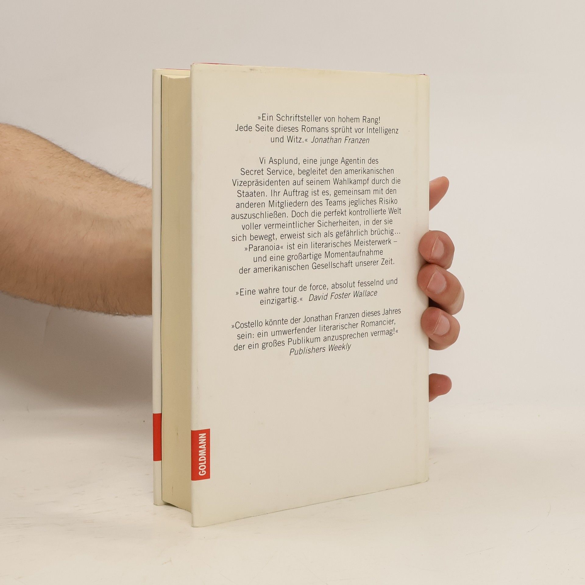 Vi Asplund wächst als Tochter eines skurrilen Versicherungsgutachters in einem kleinen Dorf in New Hampshire auf. Große Teile ihrer Kindheit verbringen Vi und ihr Bruder Jens auf Unfallstellen, zu denen ihr Vater sie mitnimmt - zu entgleisten Frachtzügen etwa oder abgebrannten Häusern. Geprägt vom Eindruck allgegenwärtiger Katastrophen flüchtet sich Vi Jahre später zum Secret Service, wo sie als junge Agentin einen nervenzerreißenden Job als Bodyguard des Vizepräsidenten bekommt. Sie bewegt sich fortan in einer künstlichen und abgeschotteten Welt bürokratischer Sicherheit, die alle Risiken von vorneherein ausschließen soll - einer Welt, in der das Grundgefühl die Paranoia ist. Doch das wirkliche Leben erweist sich als unberechenbar und bricht mit all seinen Risiken, Unwägbarkeiten und Überraschungen immer wieder mit Macht über Vi und die Menschen, die sie umgeben, herein. Publishers Weekly „Eine literarische tour de force, die in keine Schublade passt und die bis ins kleinste Detail ebenso fesselnd wie originell ist.“ David Foster Wallace