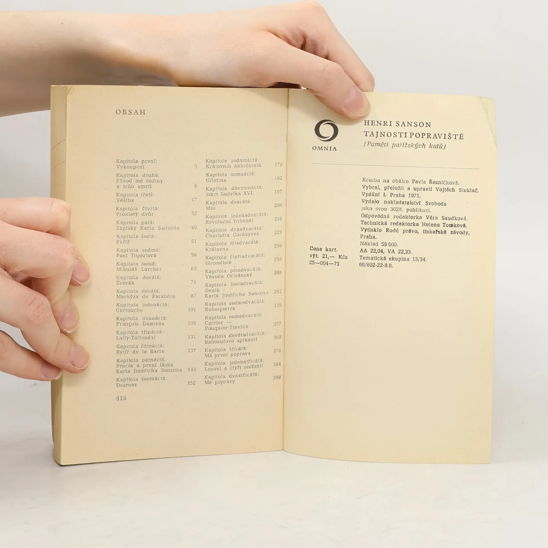 Historie rodu francouzských katů Sansonů, rodu, jehož příslušníci tento úřad vykonávali od konce 17. do poloviny 19. století. Kniha, v níž poslední potomek rodu v tomto úřadu, popravčí mistr soudního dvora v Paříži, po složení úřadu líčí podle rodových zápisů na pozadí historických událostí soukromý život i drastické zážitky jednotlivých členů rodu a uzavírá je pamětmi vlastními 25-004-71