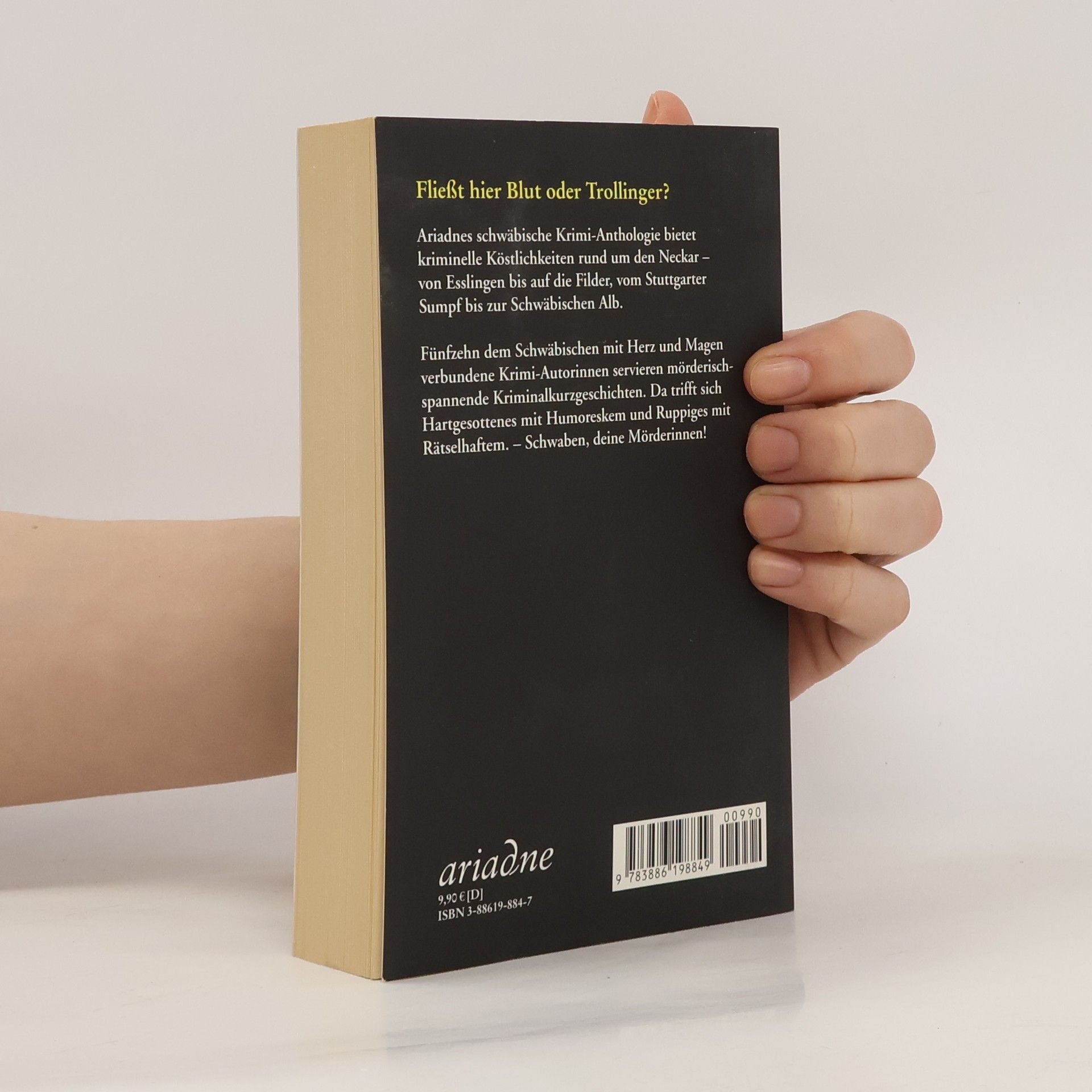 Fliesst hier Blut oder Trollinger? Ariadnes schwäbische Krimi-Anthologie bietet kriminelle Köstlichkeiten rund um den Neckar – von Esslingen bis auf die Filder, vom Stuttgarter Sumpf bis zur Schwäbischen Alb. Fünfzehn dem Schwäbischen mit Herz und Magen verbundene Krimi-Autorinnen servieren mörderisch-spannende Kriminalkurzgeschichten. Da trifft sich Hartgesottenes mit Humoreskem und Ruppiges mit Rätselhaftem. – Schwaben, deine Mörderinnen!