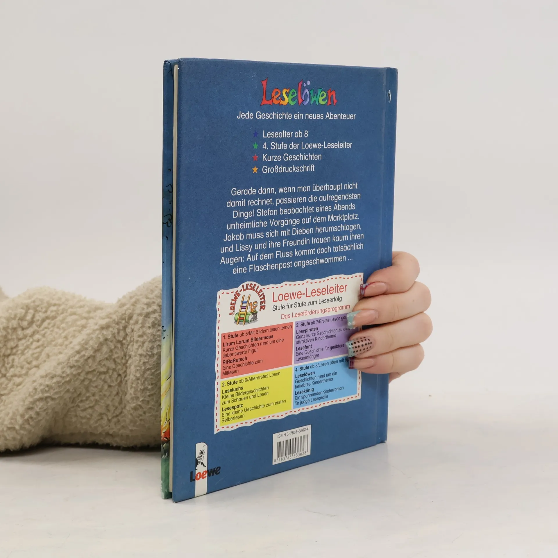 Lesealter ab 8 4. Stufe der Loewe-Leseleiter Kurze Geschichten Großdruckschrift Gerade dann, wenn man überhaupt nicht damit rechnet, passieren oft die aufregendsten Dinge! Stefan beobachtet eines Abends unheimliche Vorgänge auf dem Marktplatz. Jakob muss sich mit Dieben herumschlagen, und Lissy und ihre Freundin trauen kaum ihren Augen: Auf dem Fluss kommt doch tatsächlich eine Flaschenpost angeschwommen.