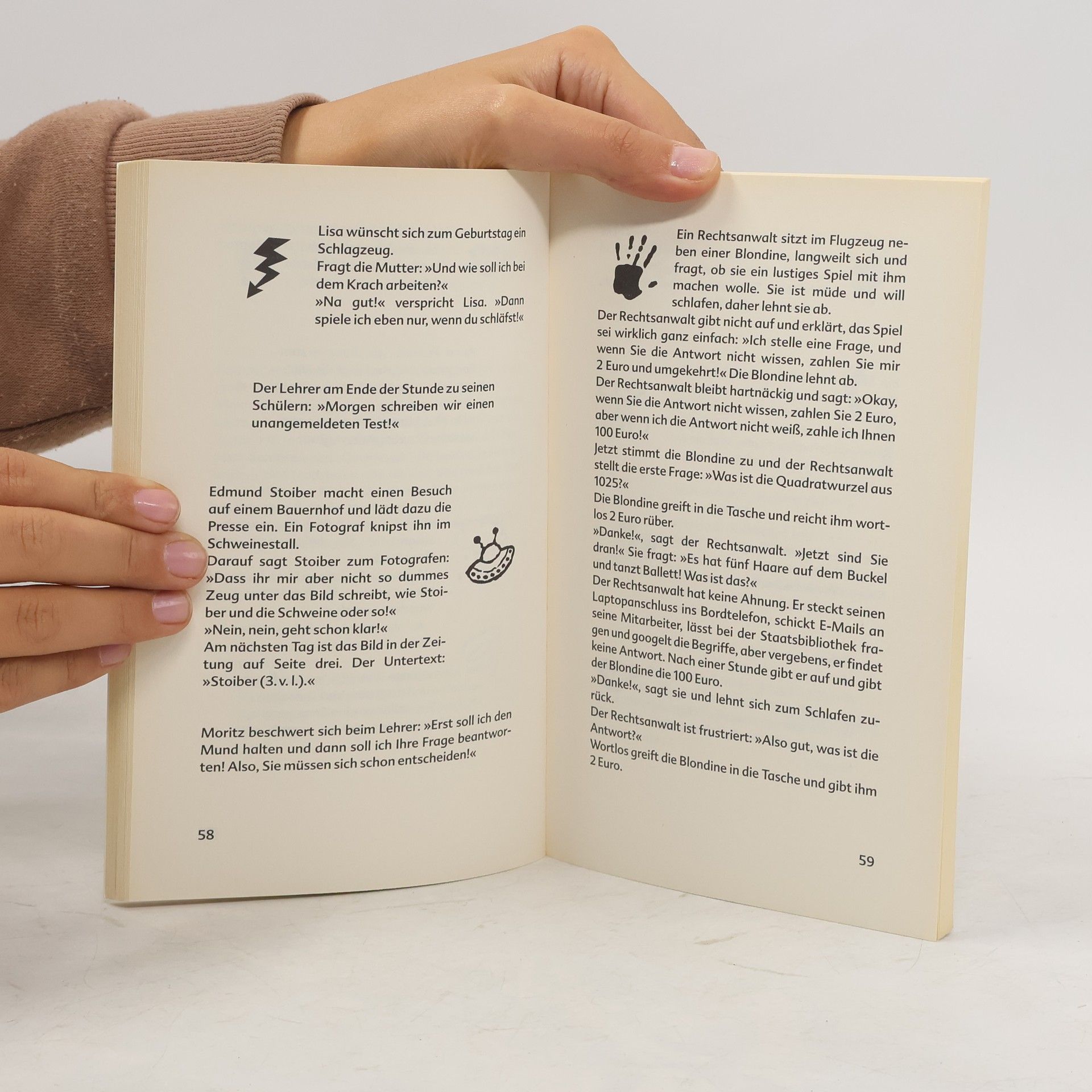 Kein Halt vor Tod und Teufel Im tiefsten Busch spricht ein junger Kannibale die hübsche Nachbarstochter an. »Darf ich Ihnen meinen Arm anbieten, gnädiges Fräulein?« fragt er galant. Die Angebetete errötet: »Nein, danke, ich hab’ schon gefrühstückt.« Nein, zartfühlend sind sie nicht, die jungen Leute von heute. Mag ihre Erscheinung auch noch so unschuldig sein, sie haben es faustdick hinter den Ohren, und die Witze, die sie sich zuflüstern, machen vor Tod und Teufel nicht halt.