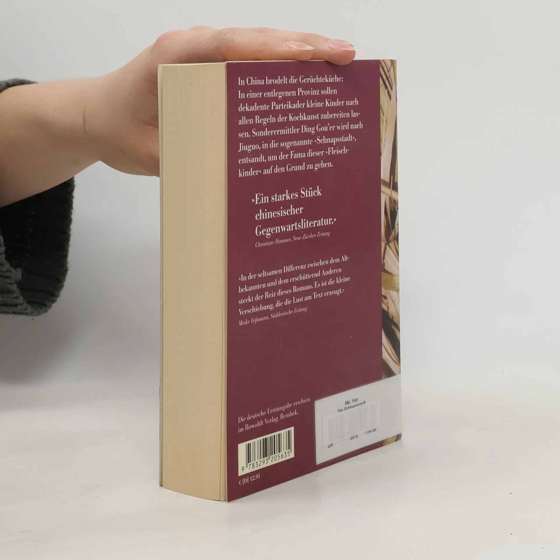 In China brodelt die Gerüchteküche: In einer entlegenen Provinz sollen dekadente Parteikader, skrupellose Parvenüs, die nach der Wirtschaftswende zu Reichtum gekommen sind, kleine Kinder nach allen Regeln der Kochkunst zubereiten lassen. Sonderermittler Ding Gou’er wird nach Jiuguo, in die so genannte »Schnapsstadt«, entsandt, um der Fama dieser »Fleischkinder« auf den Grund zu gehen. Doch kaum hat Ding den Fall aufgegriffen, sieht er sich konfrontiert mit einer wahnhaften Welt, die von Aberglaube und Korruption, von Anmaßung und Gier beherrscht wird. »Die Schnapsstadt« ist eine virtuose Groteske, eine politische Allegorie, die das neue China der toten Ideale und seine gesellschaftliche Wirklichkeit kühn gegen den Strich bürstet.