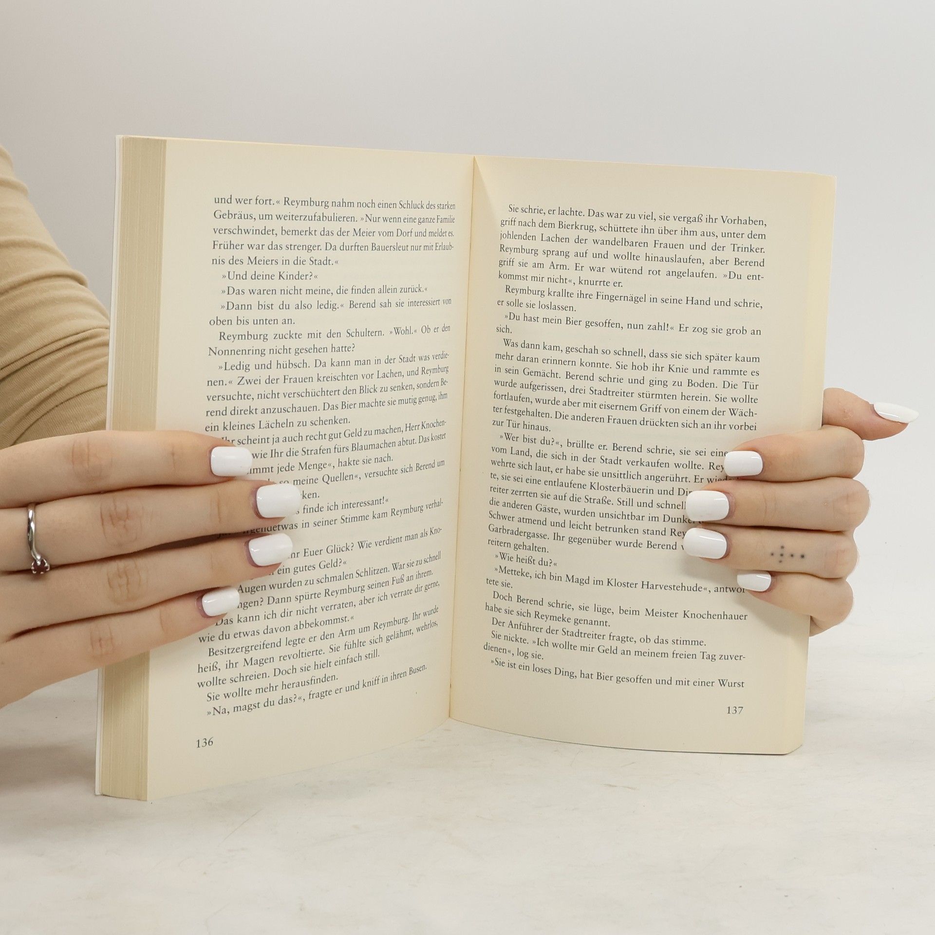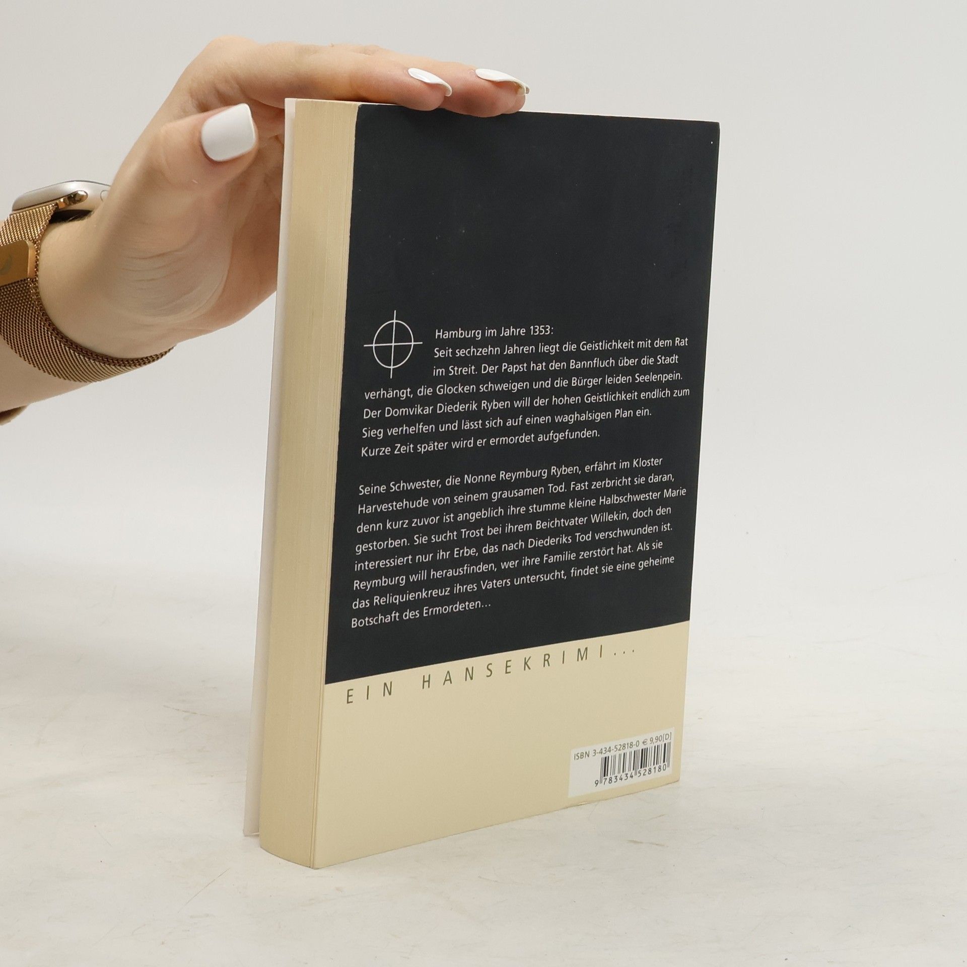 Hamburg im Jahre 1353: Seit sechzehn Jahren liegt die Geistlichkeit mit dem Rat im Streit. Der Papst hat den Bannfluch über die Stadt verhängt, die Glocken schweigen und die Bürger leiden Seelenpein. Der Domvikar Diederick Ryben will der hohen Geistlichkeit endlich zum Sieg verhelfen und lässt sich auf einen waghalsigen Plan ein. Kurze Zeit später wird er ermordet aufgefunden. Seine Schwester, die Nonne Reymburg Ryben erfährt im Kloster Harvestehude bei Hamburg von seinem grausamen Tod. Fast zerbricht sie unter dem Leid, denn kurz zuvor ist angeblich ihre stumme kleine Halbschwester Marie gestorben. Sie sucht Trost bei ihrem Beichtvater Willekin, doch den interessiert nichts als ihr Erbe, welches nach Diedericks Tod verschwunden ist. Nun will sie unbedingt herausfinden, wer ihre Familie zerstört hat. Als sie das Reliquienkreuz ihres Vaters untersucht, findet sie eine geheime Botschaft des Ermordeten…