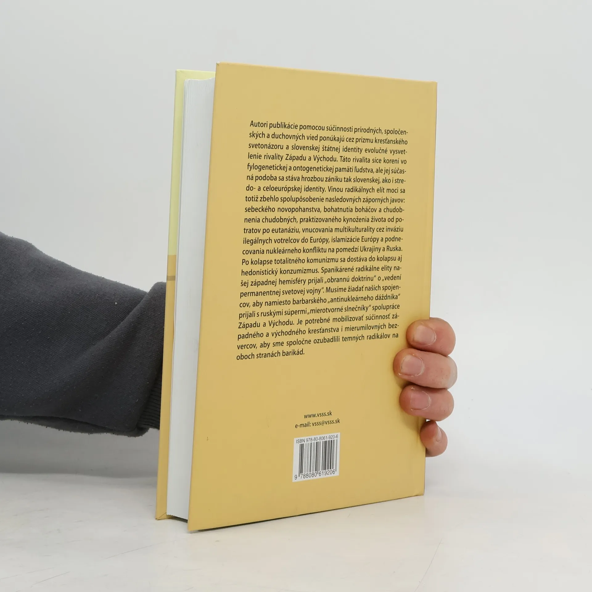 Autori publikácie pomocou súčinnosti prírodných, spoločenských a duchovných vied ponúkajú cez prizmu kresťanského svetonázoru a slovenskej štátnej identity evolučné vysvetlenie rivality Západu a Východu. Táto rivalita síce korení vo fylogenetickej a ontogenetickej pamäti ľudstva, ale jej súčasná podoba sa stáva hrozbou zániku tak slovenskej, ale i stredo- a celoeurópskej identity. Vinou radikálnych elít moci sa totiž zbehlo spolupôsobenie nasledovných záporných javov: sebeckého novopohanstva, bohatnutia boháčov a chudobnenia chudobných, praktizovaného kynoženia života od potratov po eutanáziu, vnucovania multikulturality cez inváziu ilegálnych votrelcov do Európy, islamizácie Európy a podnecovania nukleárneho konfliktu na pomedzí Ukrajiny a Ruska. Po kolapse totalitného komunizmu sa dostáva do kolapsu aj hedonistický konzumiznus. Spanikárené radikálne elity našej západnej hemisféry prijali „obrannú doktrínu“ o „vedení permanentnej svetovej vojny“. Musíme žiadať našich spojencov, aby namiesto barbarského „antinukleárneho dáždnika“ prijali s ruskými súpermi „mierotvorné slnečníky“ spolupráce Západu a Východu. Je potrebné mobilizovať súčinnosť západného a východného kresťanstva i mierumilovných bezvercov, aby sme spoločne ozubadlili temných radikálov na oboch stranách barikád.