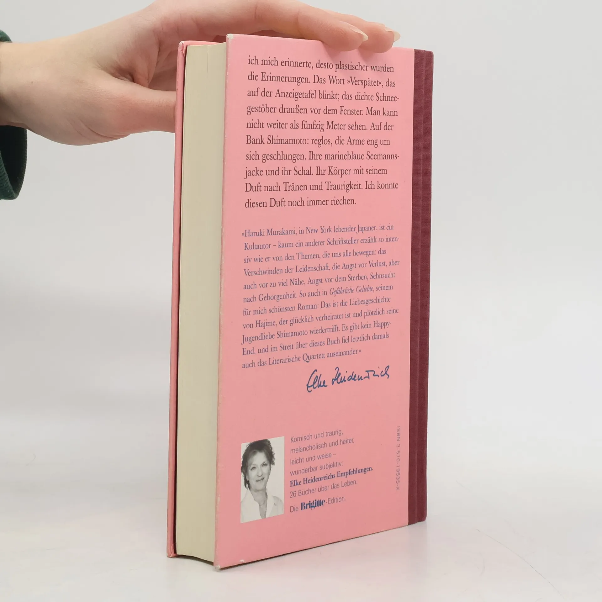 "Ich mich erinnerte, desto platischer wurden die Erinnerungen. Das Wort "Verspãtet", das auf der Anzeigetafel blinkt; das dichte Schneegestöber draußen vor dem Fenster. Man kann nicht weiter als fünfzig Meter sehen. Auf der Bank Shimamoto: reglos, die Arme eng um sich geschlungen. Ihre marineblaue Seemannsjacke und ihr Schal. Ihr Körper mit seinem Duft nach Tränen und Traurrigkeit. Ich konnte diesen Duft noch immer riechen"-- Back cover