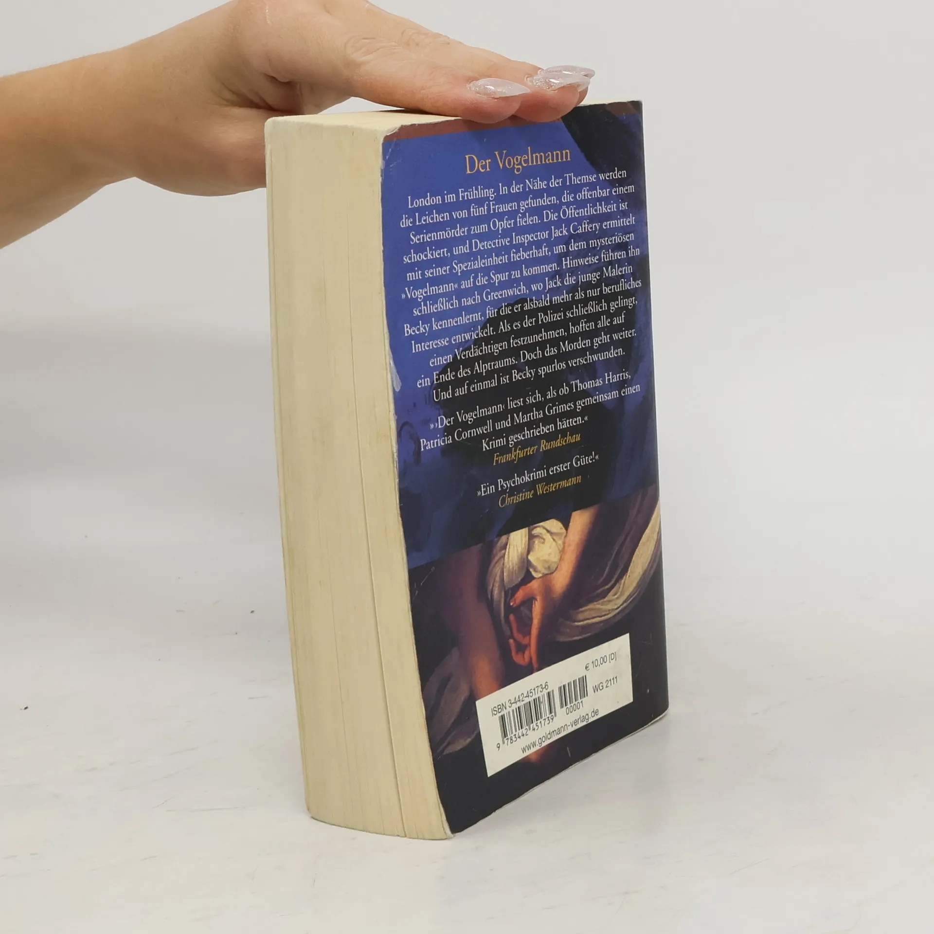 Als Detective Inspector Jack Caffery nach durchzechter Nacht seinen Rausch ausschlafen will, klingelt das Telefon: Auf einem Brachgelände in der Nähe der Themse wurden die Leichen von fünf Frauen gefunden. Die Obduktion ergibt, daß Caffery und seine Kollegen es mit einem Serienkiller zu tun haben, den sie den „Vogelmann“ nennen. Vier der fünf Opfer, so zeigen erste Ermittlungen, waren drogenabhängige Prostituierte, die niemand vermißte. Und ihr Mörder scheint schon bald gefaßt: Für Cafferys Kollegen Diamond ist klar, daß ein schwarzer Drogendealer die Frauen auf dem Gewissen hat, Polizei und Bevölkerung können aufatmen. Doch Caffery verfolgt eine ganz andere Spur. Gegen den Widerstand seiner Vorgesetzten und obendrein im Kampf mit privaten Problemen ermittelt er weiter. Erinnerungen aus der Kindheit holen ihn ein, Erinnerungen an seinen Bruder, der eines Tages beim Spielen spurlos verschwand und möglicherweise ermordet wurde. Obwohl die beiden Fälle offenbar nichts miteinander zu tun haben, kann Caffery den Gedanken an die damaligen Ereignisse nicht mehr abschütteln. Seine Suche nach dem mysteriösen „Vogelmann“ führt ihn schließlich in das Dog and Bell, ein Pub, in dem die Opfer ihre Freier suchten. Hier lernt Caffery auch die Malerin Becky kennen, die Bilder von den Mädchen im Dog and Bell malt. Caffery ist schon bald von Becky fasziniert, und sie ist es auch, die ihn auf die Fährte des Mörders bringt. Doch dann fehlt von Becky plötzlich jede Spur...
