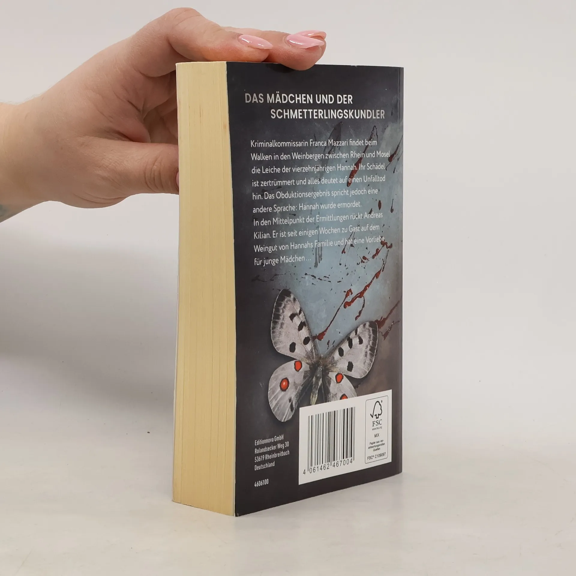 Das Mädchen und der SchmetterlingskundlerKriminalkommissarin Franca Mazzari findet beim Walken in den Weinbergen zwischen Rhein und Mosel die Leiche der vierzehnjährigen Hannah. Ihr Schädel ist zertrümmert und alles deutet auf einen Unfalltod hin. Das Obduktionsergebnis spricht jedoch eine andere Hannah wurde ermordet. In den Mittelpunkt der Ermittlungen rückt Andreas Kilian. Er ist seit einigen Wochen zu Gast auf dem Weingut von Hannahs Familie und hat eine Vorliebe für junge Mädchen ...