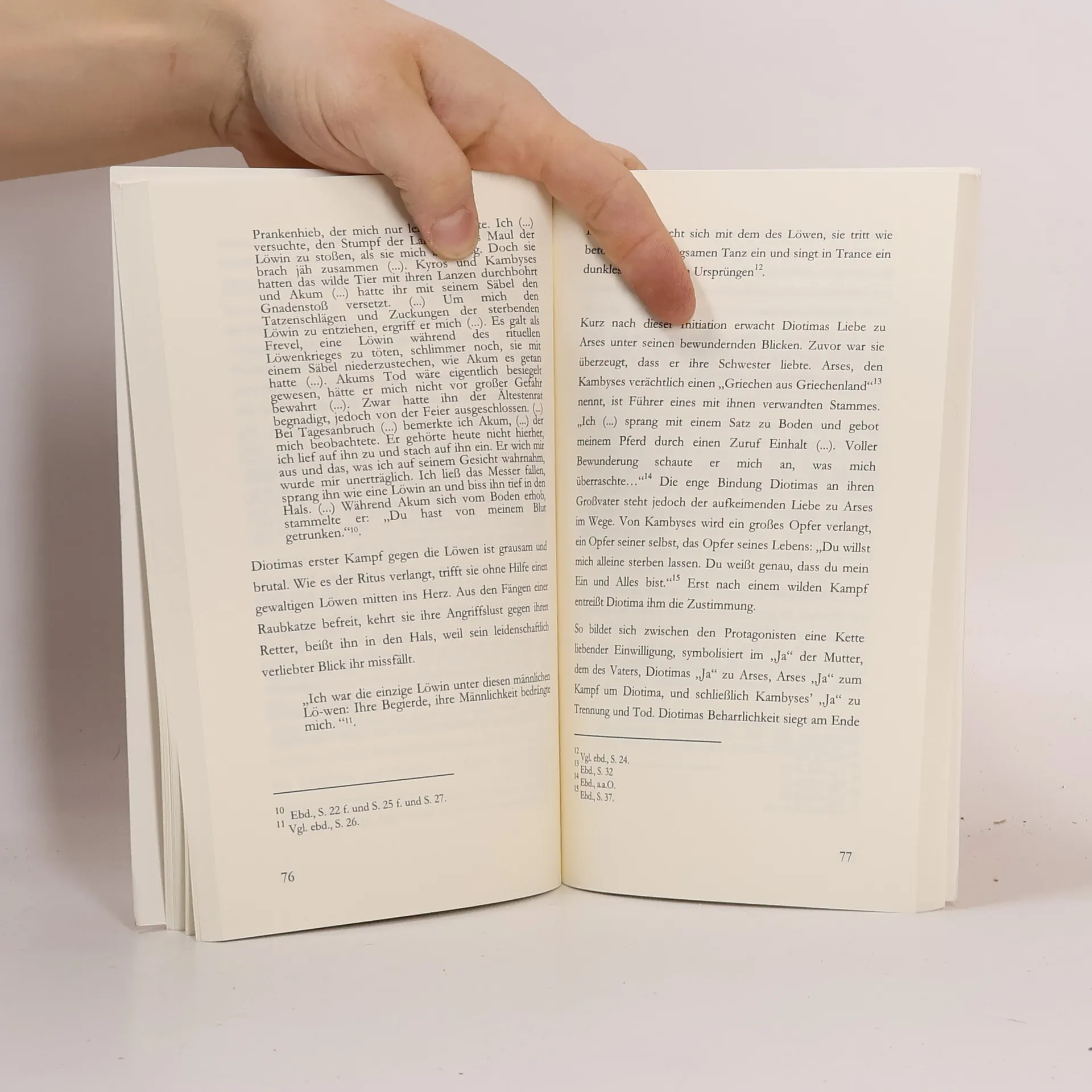 Im Nachhinein erschien uns nun die vom Verlagshaus Actes Sud vorgegebene Herauslösung des Berichtes der Rückblende auf Diotimas Jugend nicht mehr als eine „Amputation“, sondern als eine sinnstiftende eigenständige Veröffentlichung. Unsere eigene Annäherung an diesen Text erklärt, warum wir Okou Dagou um ein ausführliches Nachwort gebeten haben, das die schrittweise Entdeckung der Sinnstufen in Bauchaus narrativer Prosa nachvollzieht. Ist Henry Bauchau darum ein schwieriger Autor? Wir meinen, nein. Keiner muss Diotima und die Löwen mit unseren Augen lesen. Es ist das Schöne an der Literatur, dass ihre Deutungen frei, wenngleich niemals beliebig sind. Der Autor lässt seine Figuren in einem der gehobenen Alltagssprache abgelauschten Stil erzählen, in dem das Passé composé oder das Präsens an die Stelle von Passé simple und Imparfait getreten sind. Damit illustriert er sinnfällig, dass auch komplexe Gedankengänge in einer leicht fasslichen Sprache vorgebracht werden können, die eine sukzessive Annäherung tieferer Verständnisebenen ermöglicht.