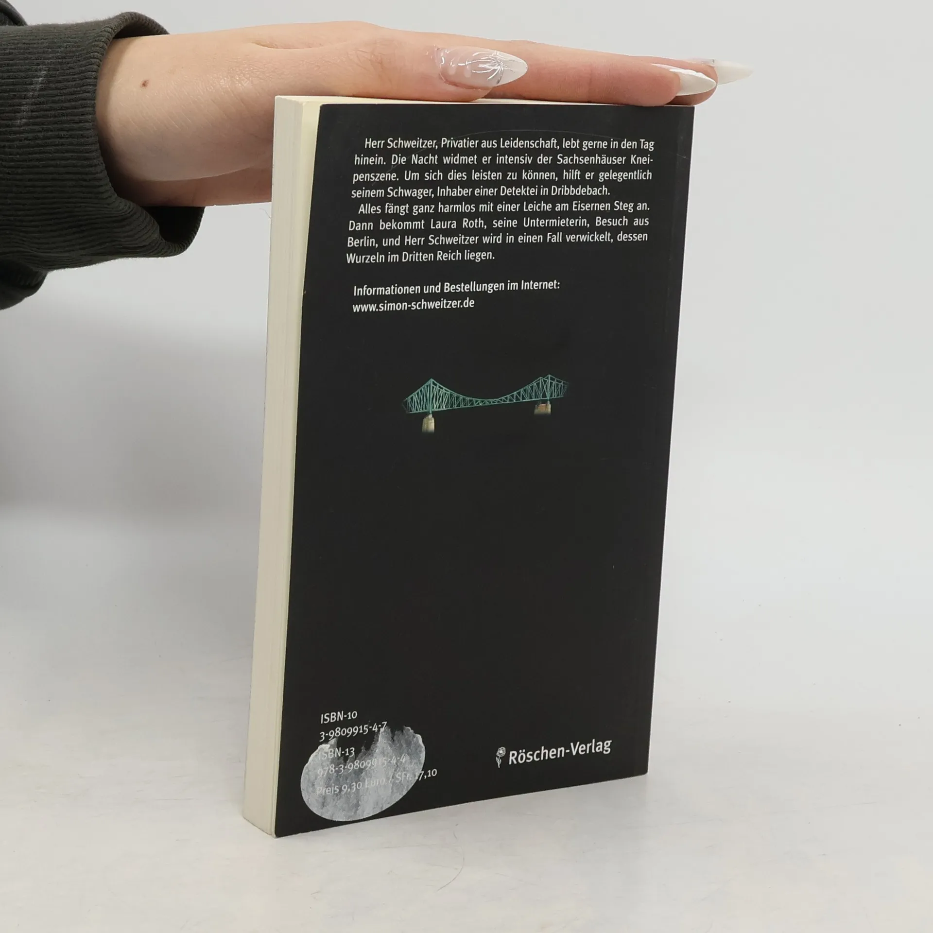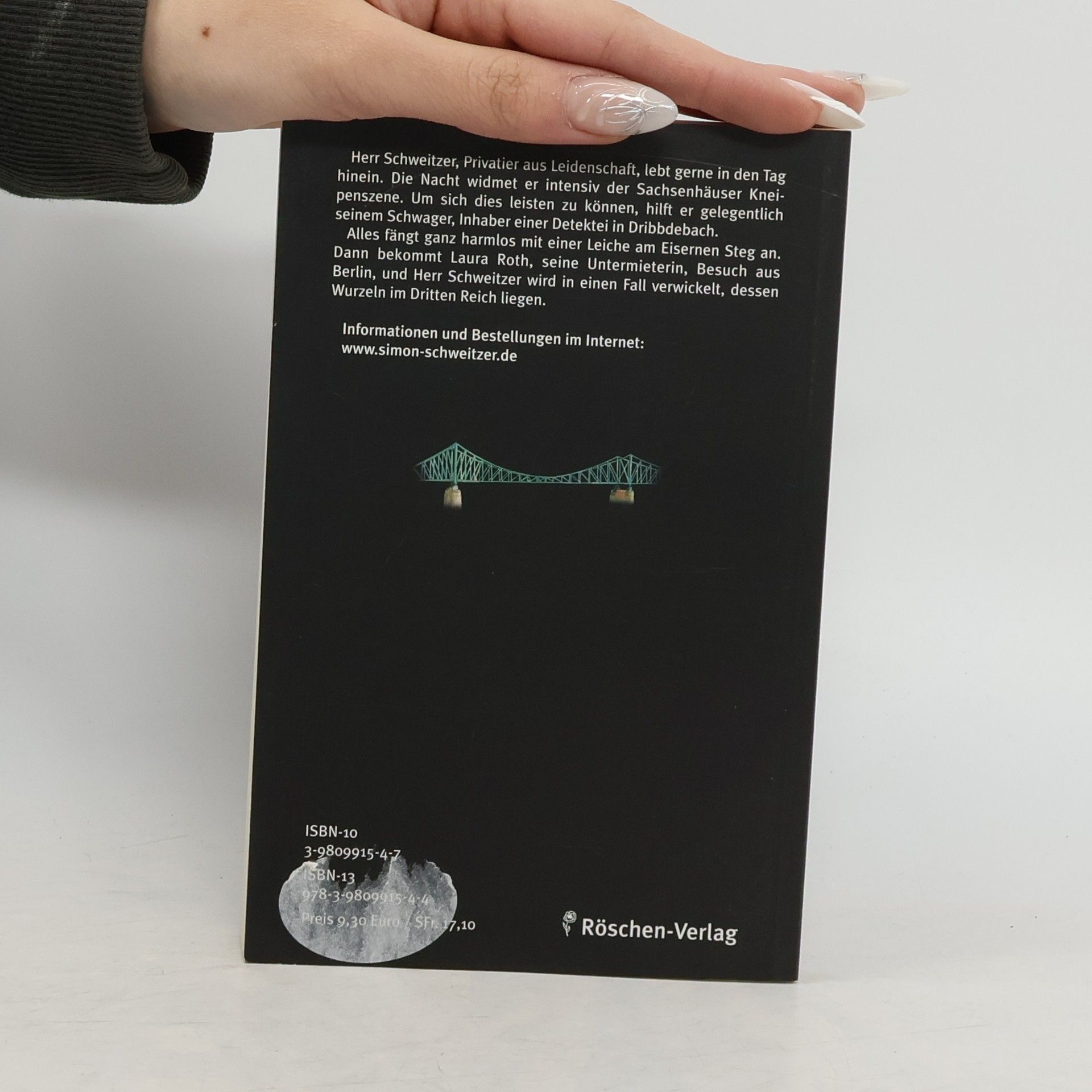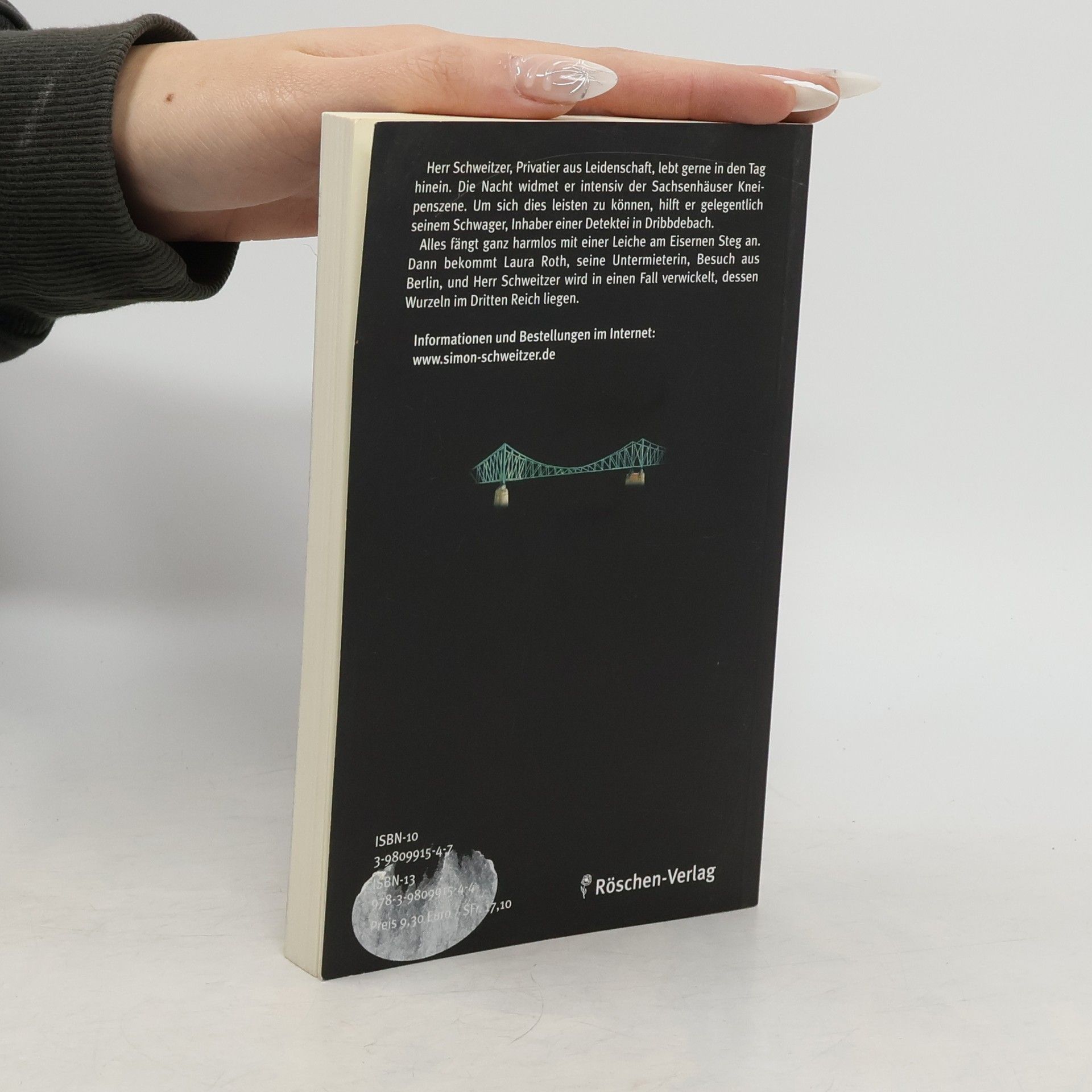 Alles fängt ganz harmlos mit einer Leiche am Eisernen Steg an. Dann bekommt Laura Roth, Simon Schweitzers Untermieterin, Besuch aus Berlin, und Herr Schweitzer wird in einen Fall verwickelt, dessen Wurzeln im Dritten Reich liegen. Frank Demant, geboren 1959 in Frankfurt/Main, aufgewachsen im Stadtteil Fechenheim. Besuchte das Helmholtz-Gymnasium in Bornheim. Von 1984 bis 2005 Taxifahrer in Frankfurt. Seit Mai 2005 ist Demant freier Schriftsteller. Lebt abwechselnd in Frankfurt und Costa Rica.