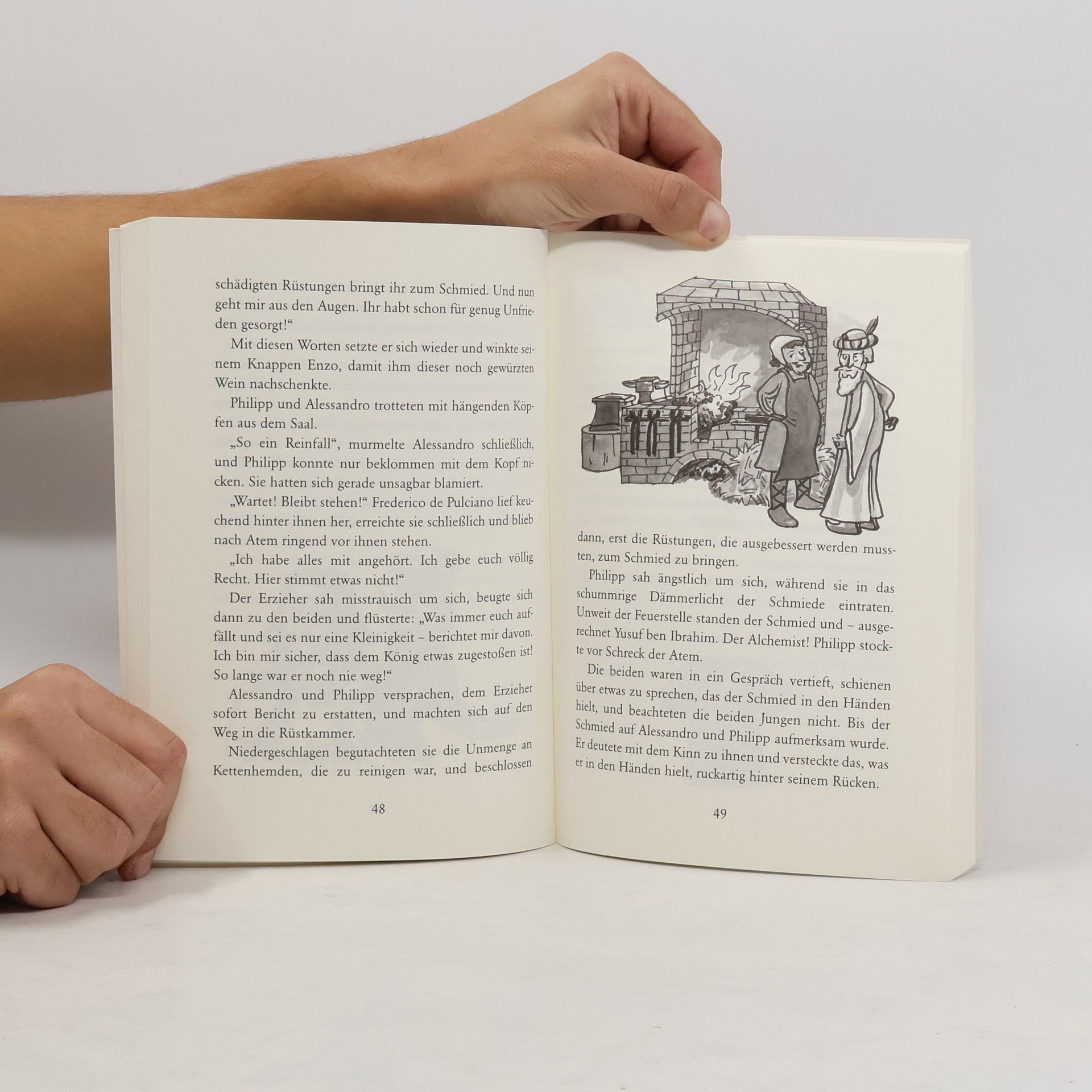 Die Pagen Philipp und Alessandro sind höchst beunruhigt: Ihr Freund Friedrich, der junge König von Sizilien, ist seit Tagen verschwunden. Zwar hat er sich schon so manches Mal in Palermo rumgetrieben, aber so lange war er noch nie fort. Und ohne seinen Falken würde er normalerweise keinen Schritt tun. Ob die geheimnisvollen acht Ritter, die zum Turnier auf der Burg angereist sind, etwas mit Friedrichs Verschwinden zu tun haben? Philipp und Alessandro machen sich auf eine gefährliche Suche. Für Abbildung von Innenseite bitte links klicken!