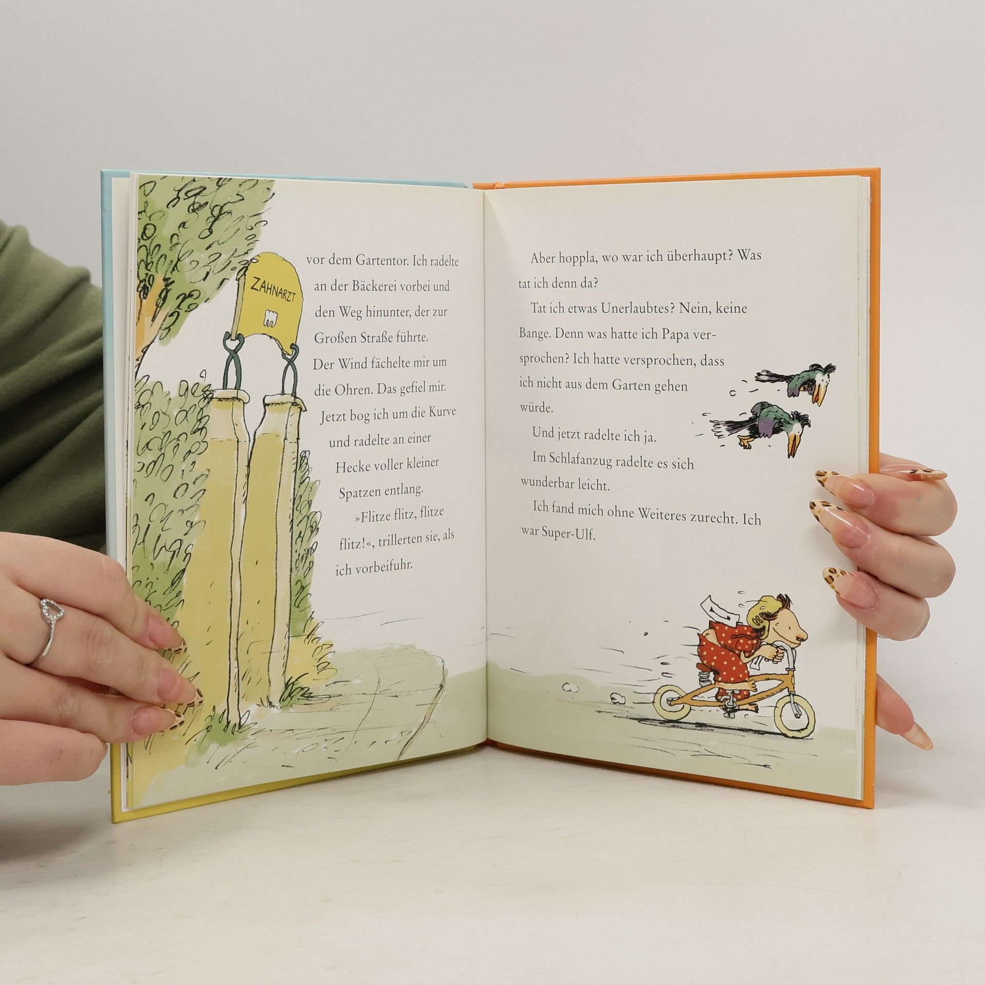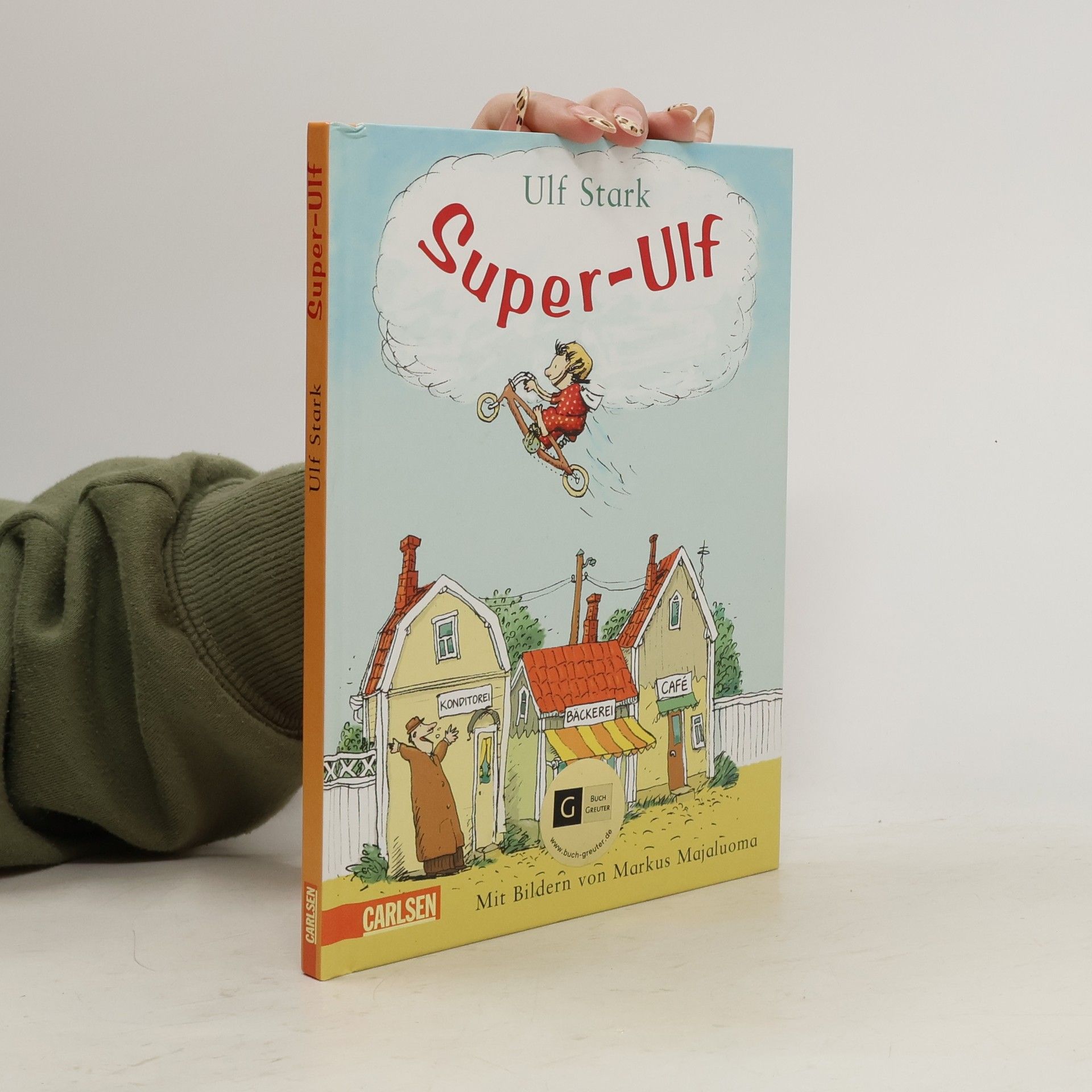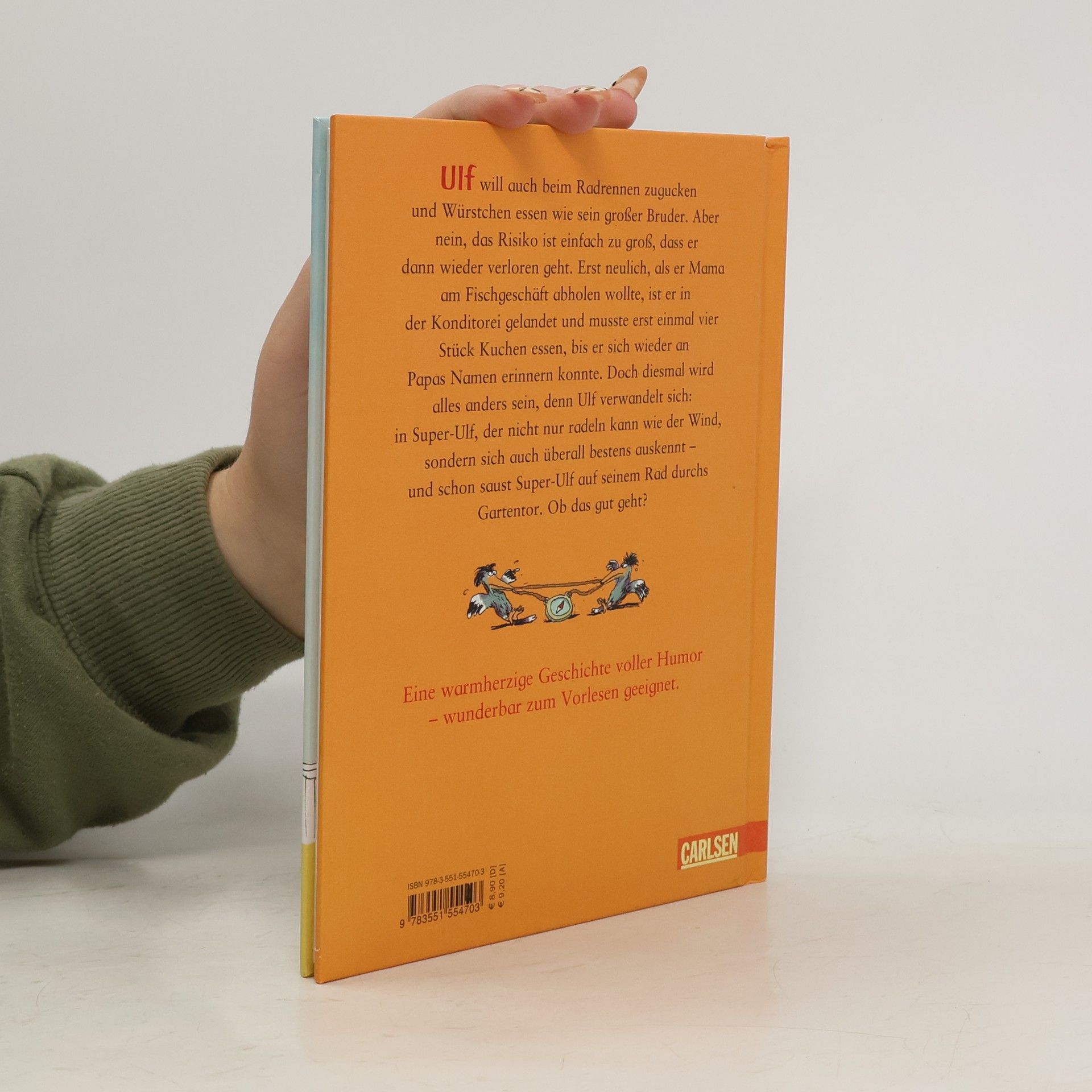 Wie gerne würde Ulf mitkommen, als sein großer Bruder loszieht, um beim Radrennen zuzugucken und Würstchen zu essen. Aber nein, das Risiko ist einfach zu groß, dass Ulf wieder einmal verloren geht. Erst neulich, als er Mama am Fischgeschäft abholen wollte, ist er in der Konditorei gelandet und musste erst einmal vier Stück Kuchen essen, bis er sich wieder an Papas Namen erinnern konnte. Doch diesmal wird alles anders sein, denn Ulf verwandelt sich. In Super-Ulf, der nicht nur Mörder fangen und radeln kann wie der Wind, nein er kennt sich auch überall bestens aus – und schon saust Super-Ulf auf seinem Rad durchs Gartentor. Ob das gut geht?