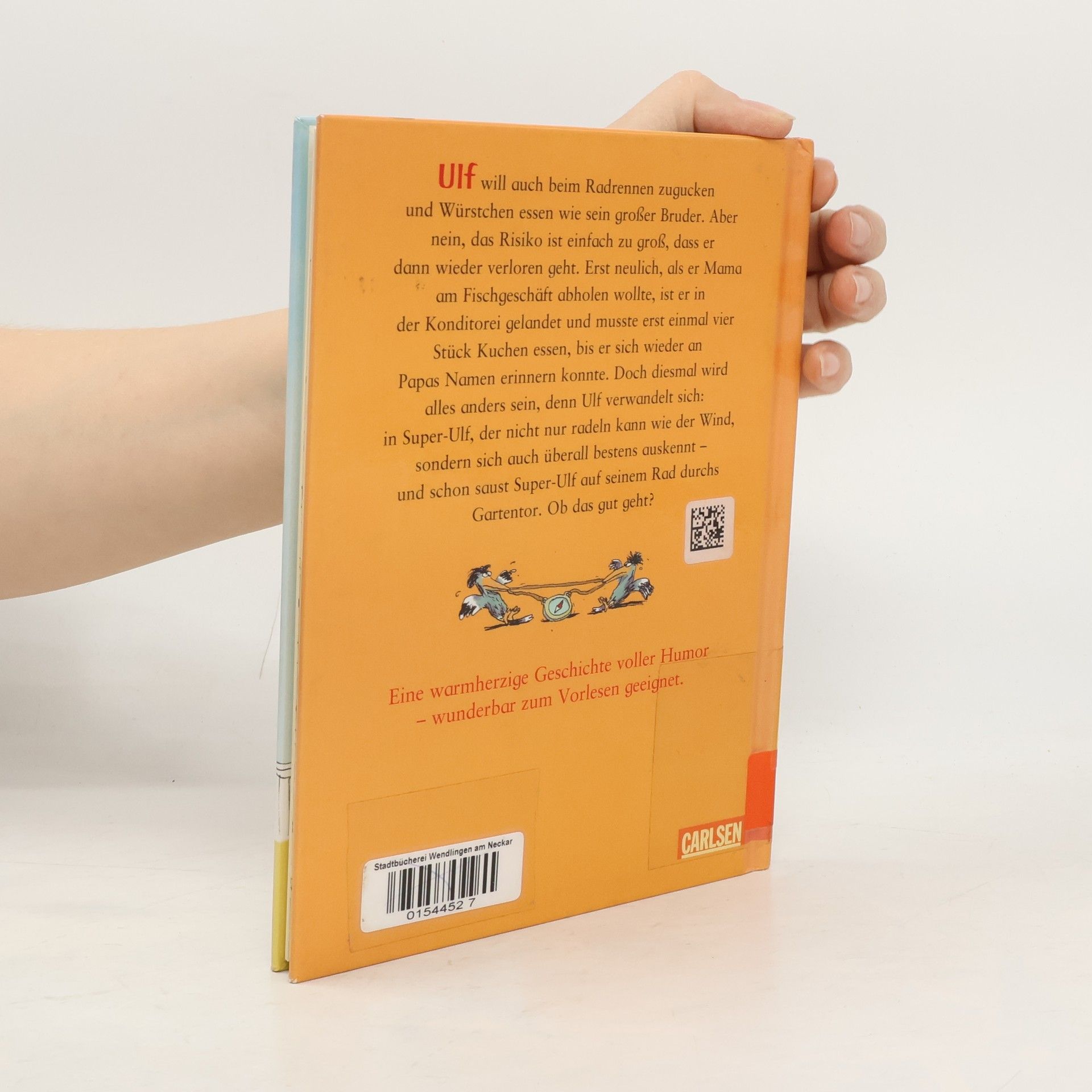 Wie gerne würde Ulf mitkommen, als sein großer Bruder loszieht, um beim Radrennen zuzugucken und Würstchen zu essen. Aber nein, das Risiko ist einfach zu groß, dass Ulf wieder einmal verloren geht. Erst neulich, als er Mama am Fischgeschäft abholen wollte, ist er in der Konditorei gelandet und musste erst einmal vier Stück Kuchen essen, bis er sich wieder an Papas Namen erinnern konnte. Doch diesmal wird alles anders sein, denn Ulf verwandelt sich. In Super-Ulf, der nicht nur Mörder fangen und radeln kann wie der Wind, nein er kennt sich auch überall bestens aus – und schon saust Super-Ulf auf seinem Rad durchs Gartentor. Ob das gut geht?