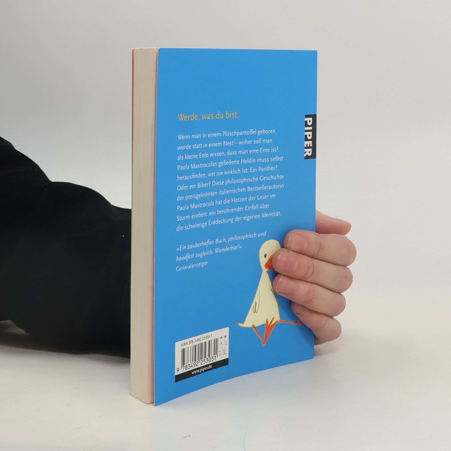 Wenn man in einem Plüschpantoffel geboren wurde statt in einem Nest – woher soll man als kleine Ente wissen, dass man eine Ente ist? Paola Mastrocolas kleine gefiederte Heldin muss selbst herausfinden, wer sie wirklich ist: Ein Panther? Oder ein Biber? Das philosophische Märchen der preisgekrönten italienischen Bestsellerautorin Paola Mastrocola hat die Herzen der Leser im Sturm erobert: eine zauberhafte Geschichte über die schwierige Entdeckung der eigenen Identität.