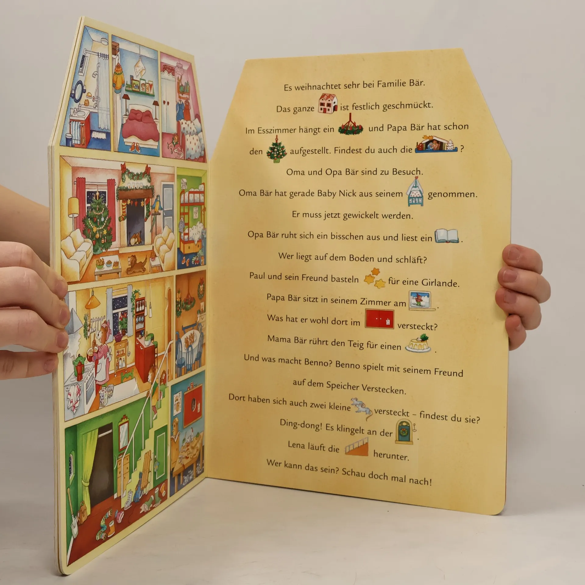Bei Familie Bär ist ganz schön was los vor Weihnachten! Im großen Hausquerschnitt kann man in jedes Zimmer sehen und nachschauen, was die Bären gerade machen. Eine kleine Bild-Wörter-Geschichte lädt zum Mitlesen und Mitsuchen ein und viele Klappen auf den Seiten bieten zusätzliche Überraschungen!