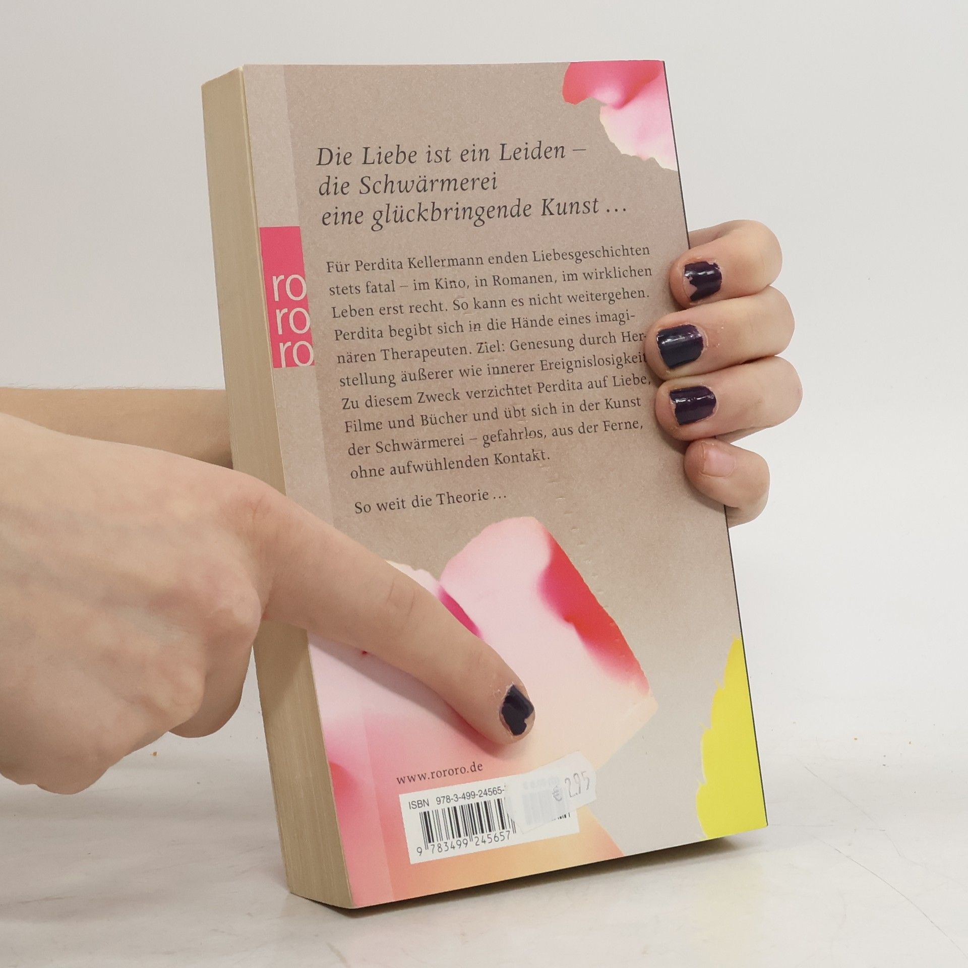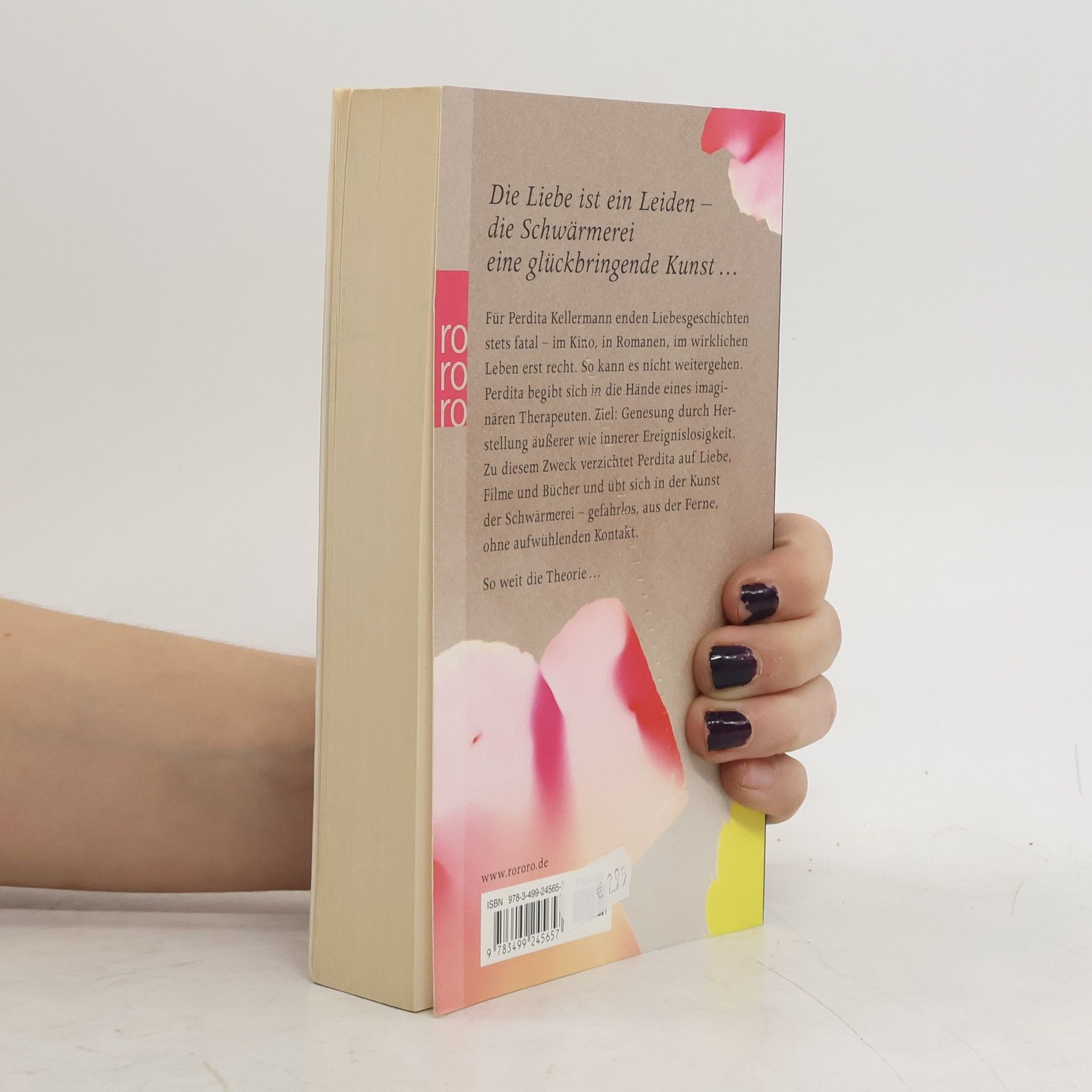Die Liebe ist ein Leiden – die Schwärmerei eine glückbringende Kunst … Für Perdita Kellermann enden Liebesgeschichten stets fatal - im Kino, in Romanen, im wirklichen Leben erst recht. So kann es nicht weitergehen. Perdita begibt sich in die Hände eines imaginären Therapeuten. Ziel: Genesung durch Herstellung äußerer wie innerer Ereignislosigkeit. Zu diesem Zweck verzichtet Perdita auf Liebe, Filme und Bücher und übt sich in der Kunst der Schwärmerei - gefahrlos, aus der Ferne, ohne aufwühlenden Kontakt. So weit die Theorie ...