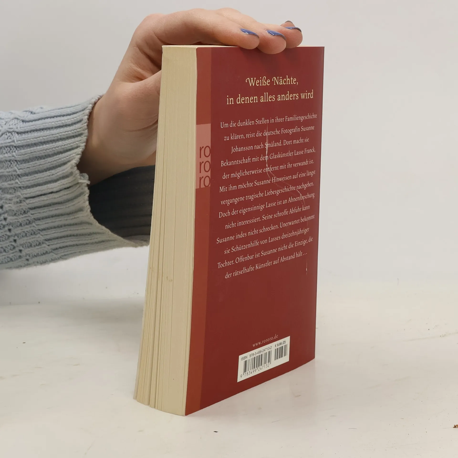 Weiße Nächte, in denen alles anders wird Um die dunklen Stellen in ihrer Familiengeschichte zu klären, reist die deutsche Fotografin Susanne Johansson nach Småland. Dort macht sie Bekanntschaft mit dem Glaskünstler Lasse Franck, der möglicherweise entfernt mit ihr verwandt ist. Mit ihm möchte Susanne Hinweisen auf eine längst vergangene, tragische Liebesgeschichte nachgehen. Doch der eigensinnige Lasse ist an Ahnenforschung nicht interessiert. Seine schroffe Abfuhr kann Susanne indes nicht schrecken. Unerwartet bekommt sie Schützenhilfe von Lasses dreizehnjähriger Tochter. Offenbar ist Susanne nicht die Einzige, die der rätselhafte Künstler auf Abstand hält …