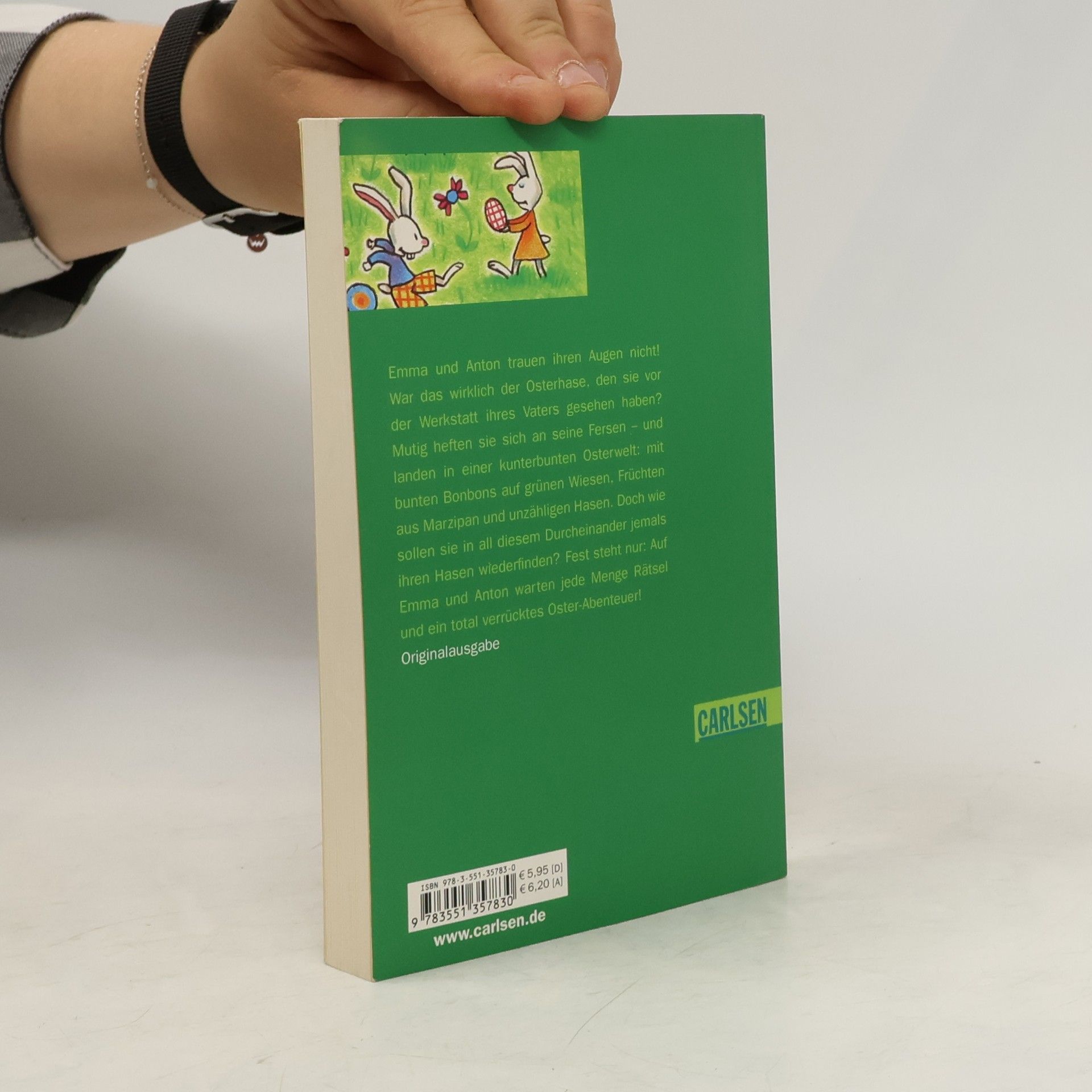 Emma und Anton trauen ihren Augen nicht, als sie kurz vor Ostern einen mit einer Latzhose bekleideten Hasen dabei beobachten, wie er aus der Schreinerwerkstatt ihres Vaters einen Schraubenzieher stiehlt. Die beiden beschließen dem Hasen zu folgen und es passiert etwas Unglaubliches! Sie landen in einer kunterbunten Osterwelt: auf der grünen Wiese wachsen bunte Bonbons und Lollis, die Früchte an Bäumen und Sträuchern sind aus Marzipan, es gibt sogar einen Schokoladensee! Und überall tollen Osterhasen herum. Bis Emma und Anton jedoch dahinter kommen, warum „ihr“ Hase das Werkzeug genommen hat, müssen sie jede Menge Rätsel lösen und erleben am Ende ein total verrücktes Oster-Abenteuer!
